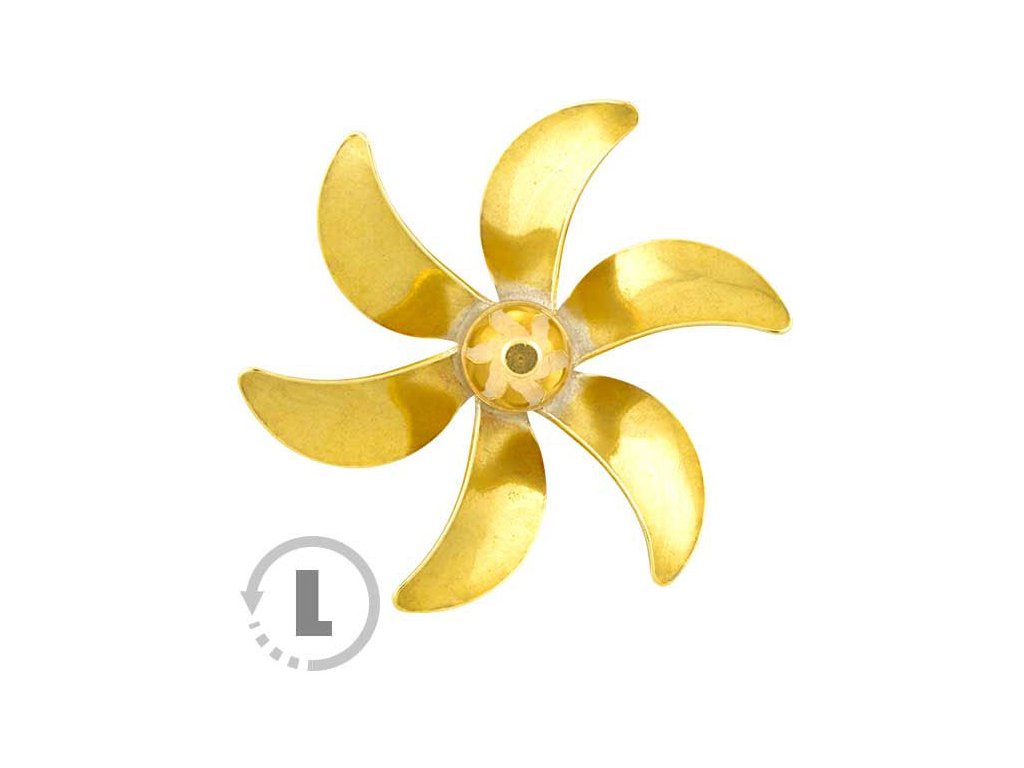 Raboesch lodní šroub tř.172 6-listý, průměr 40mm, směr otáčení levý, montáž na hřídel se závitem M4, materiál mosaz pájená stříbrem.