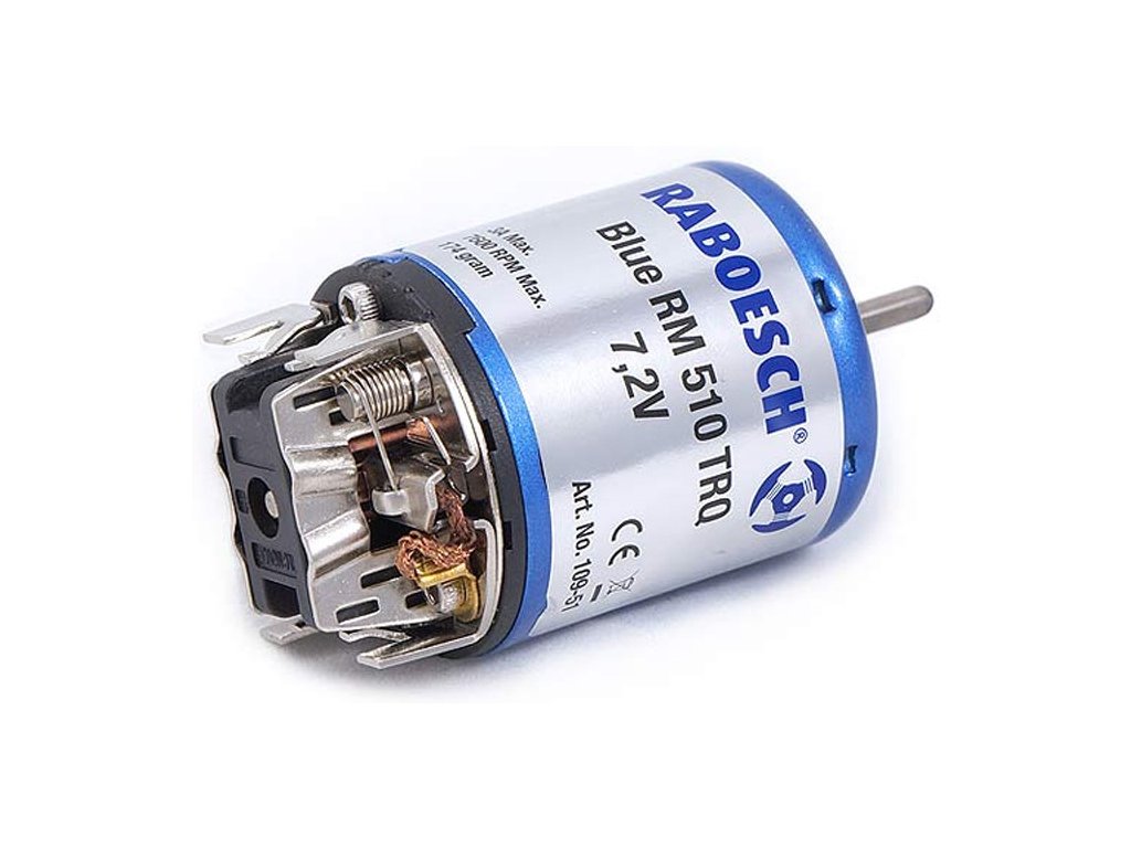 Raboesch motor stejnosměrný s vysokým točivým momentem, Blue RM-510 TRQ 7.2V. Rozsah napětí 6-9V, průměr hřídele 3,2mm. Hmotnost 174g. Proud při max. výkonu 2,2A při 5800ot./min.