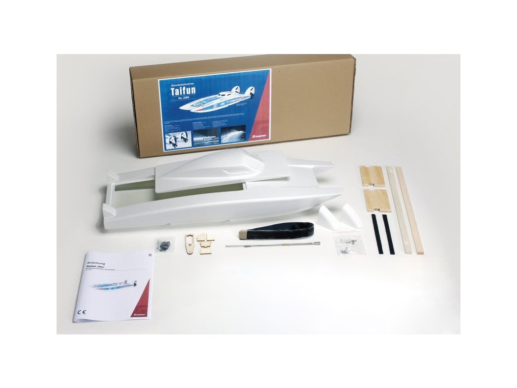 Model je vyroben výhradně z ručně barveného laminátu. Geometrie trupu obou plováků zajišťuje optimální přilnavost na vodní hladině, a to i při nejvyšších rychlostech. Otvory pro připojení dvou přívěsů jsou již k dispozici, všechny díly GFK jsou řezány do absolutní přesnosti. Struktura je tedy snadná a rychle dokončitelná. Součástí soupravy jsou podrobné ilustrované pokyny a přesně nařezaný obtiskový list. Model nabízí obrovský potenciál pro vlastní návrhy. Lze implementovat další jednotky. Stavebnice neobsahuje barevné obtisky/samolepky.