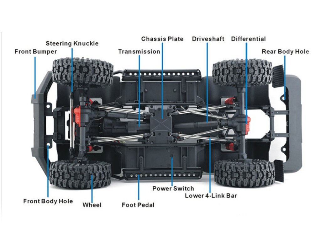 Nápravy mají porátovou strukturu pro další zpřevodování a zvýšenou světlou výšku. Díky CVD poloosám je maximální úhel zatáčení až 42 stupňů. Přední i zadní diferenciál mohou být navíc nezávisle ovládány pomocí tlačítek vysílače se světelnou indikací stavu.