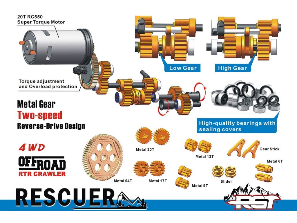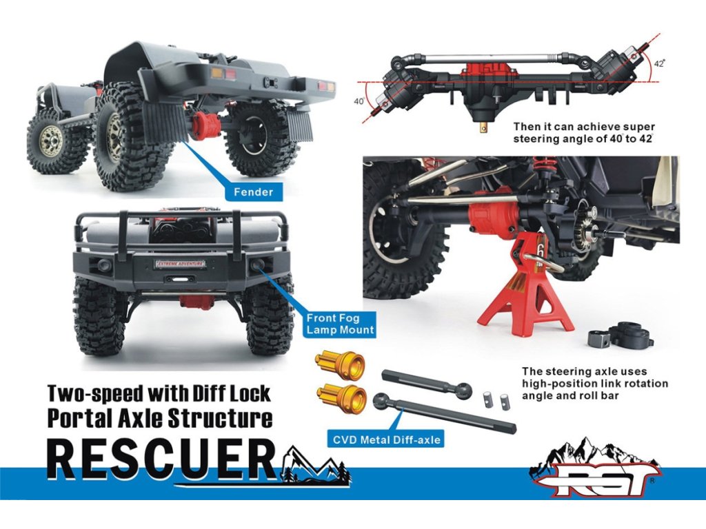 Rescuer má pevný rám podvozku, rozvor 324mm, 2rychlostní převodovku s reverzní rotací, maximální úhel zatáčení 42 stupňů, portálové nápravy s uzamykatelnými diferenciály, kovové převody, nastavitelné kovové "piggyback" tlumiče s dvojími pružinami, kvalitní utěsněná ložiska, nebo kovové CVD poloosy.
