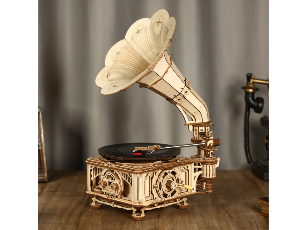 RoboTime 3D dřevěná mechanická skládačka Gramofon (ruční pohon) - poškozený obal
