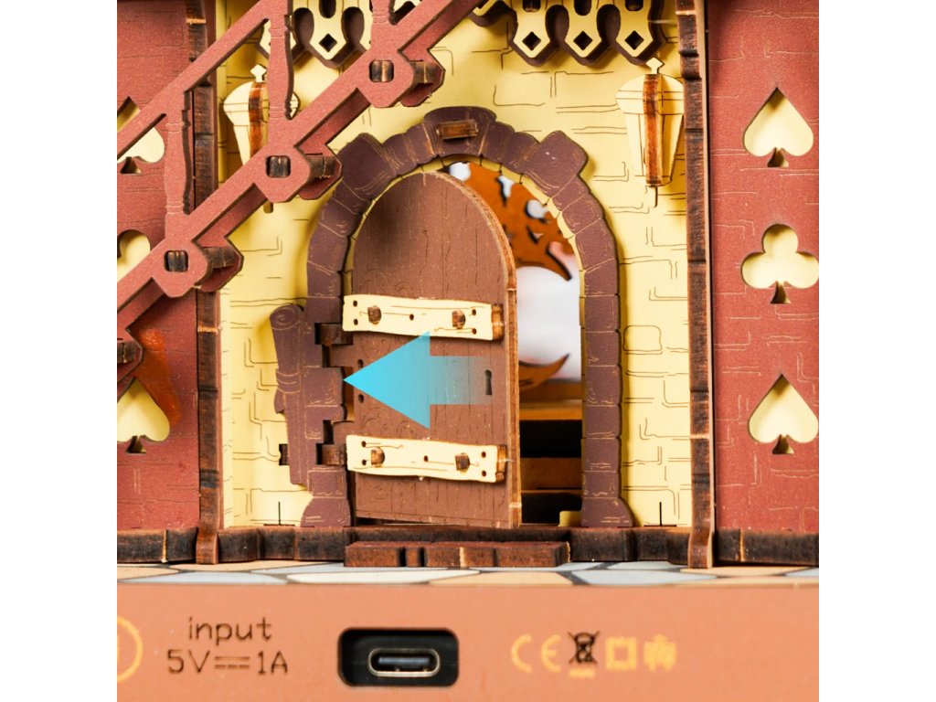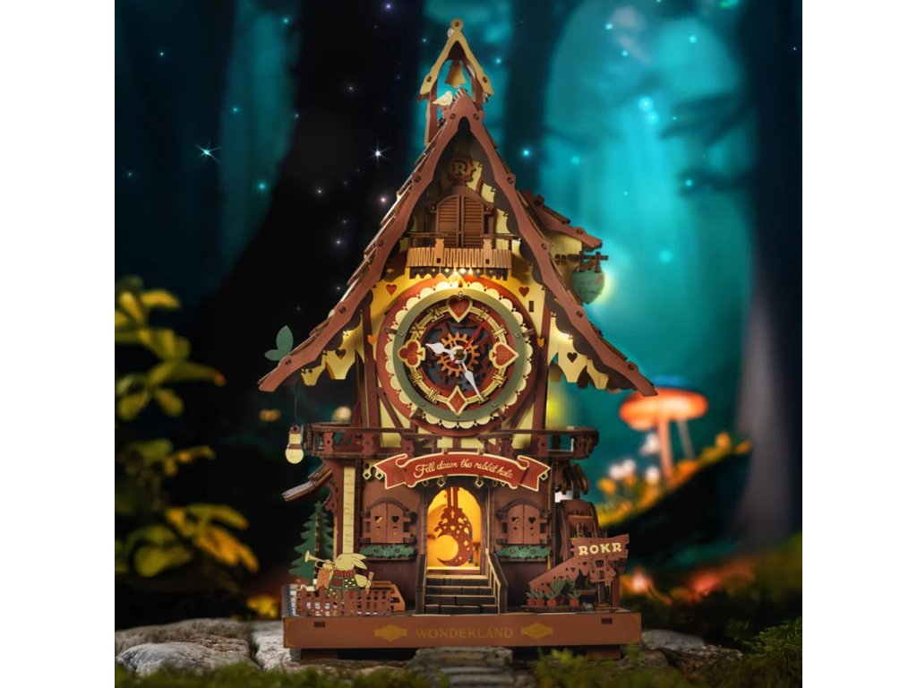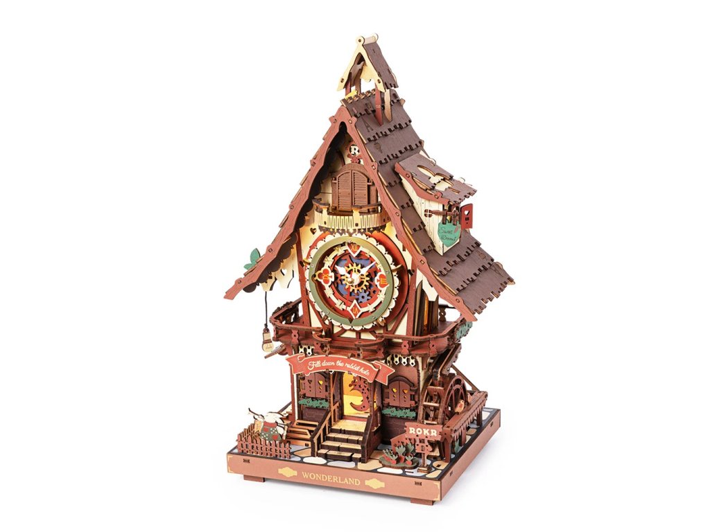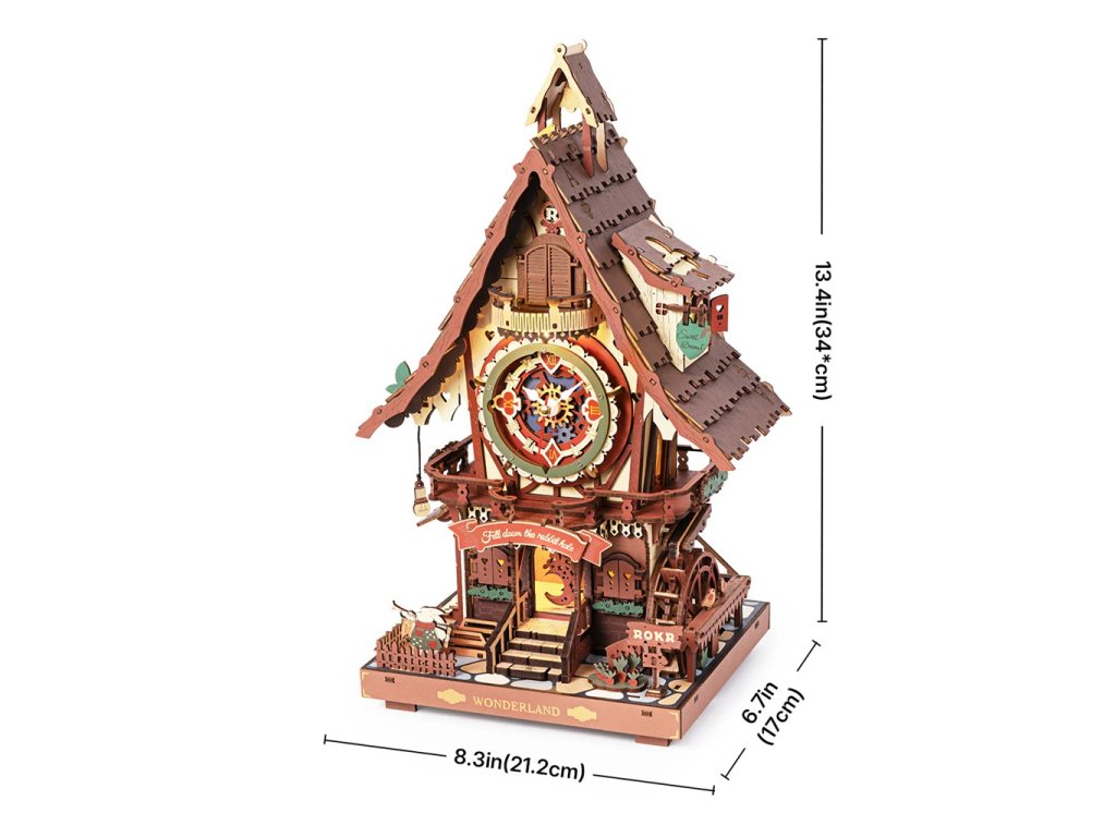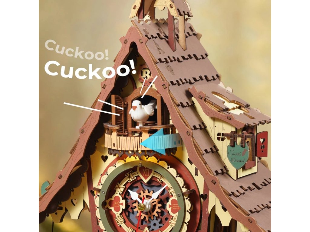 Kukačkové hodiny jako z pohádky! Ukazují přesný čas, okouzlí Vás hravými detaily a přinášejí krásu tradičního řemesla. Představují lesní chaloupku ukrytou v kouzelném lese, doplněnou točícím se vodním kolem, dřevěným plotem a zahrádkou. Hodiny mají kukačku, kyvadlo ve tvaru půlměsíce, doškovou střechu a mnoho dalších prvků. Mezi hravé detaily patří symboly karetních motivů na střeše i ciferníku. Skrytý přepínač jako součást schodů umožňuje spustit zvuk kukačky nebo nastavit hodinový zvukový režim. Po zapnutí hodinového režimu vykoukne každou celou hodinu veselá kukačka z okénka, roztáhne křídla a zazpívá jemnou melodii. Zvuk kukačky a hodinový mechanismus jsou elektronicky propojeny. Skládačka využívá quartzový strojek řízený křemenným krystalem, který zajišťuje vysokou přesnost. Časový signál z hodinového strojku je spolehlivě přenášen do mechanismu kukačky. Teplé tóny osvětlení prozáří každý kout a vytvoří kouzelnou pohádkovou atmosféru.