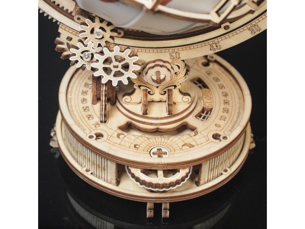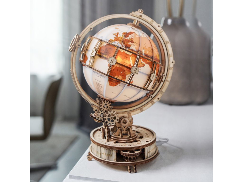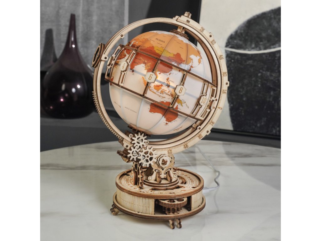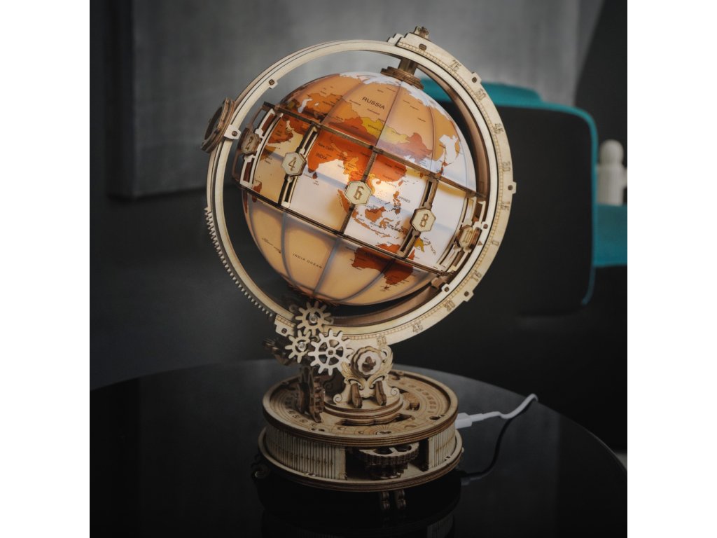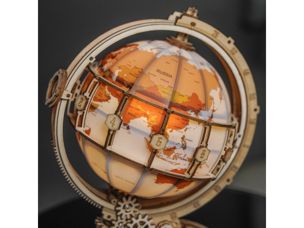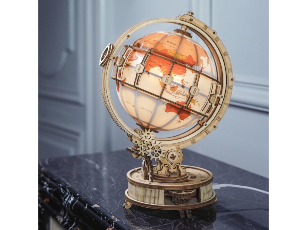 Díky stavebnici glóbu z překližky se neztratíte ve světě, a to ani v noci! Prostřednictvím jeho stavby můžete dát odpočinout své mysli od každodenního shonu, prověřit své dovednosti, trpělivost a schopnost soustředění. Výsledný model můžete využít jako atraktivní noční lampičku, pro tento účel je uvnitř vybaven LED světelným zdrojem o nízké spotřebě, s nenápadným vypínačem a napájením v podobě rozšířeného microUSB, či USB‑A konektoru. Glóbem je možno otáčet prostřednictvím částečně odhalené a poutavě zpracované soustavy převodů. Na svém obvodu je opatřen také mechanicky ovládanou lupou, s pomocí které přečtete i nejdrobnější nápisy na jeho povrchu. Členitá konstrukce je vyvedena v retro stylu, zdobí ji četné ornamenty, ale také stupnice k určování zeměpisné polohy, nebo označení časových pásem. Skládačka je dodávána v nesloženém stavu, balena v krabici. Vybaveno detailním návodem k sestavení.