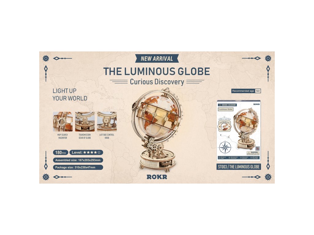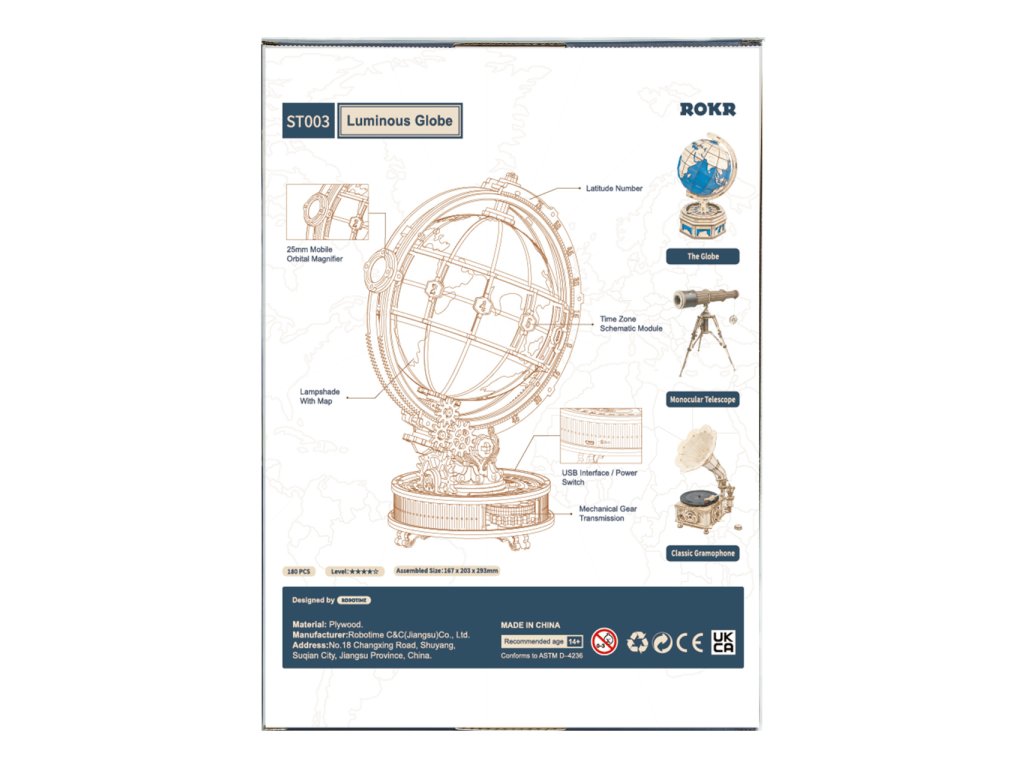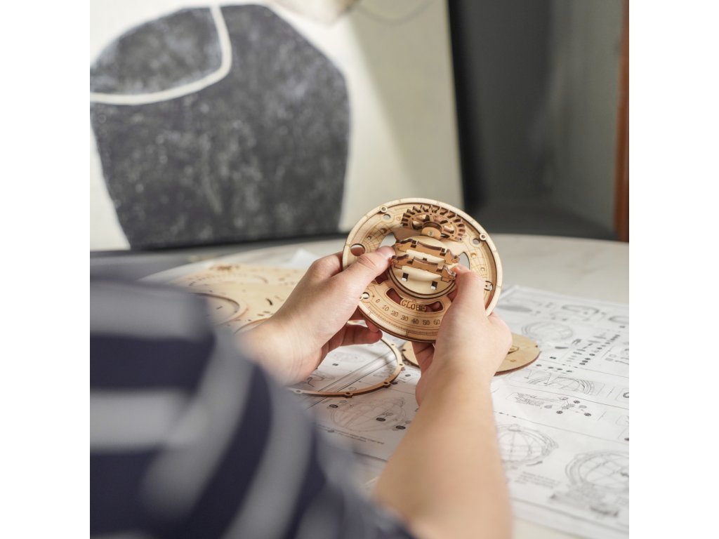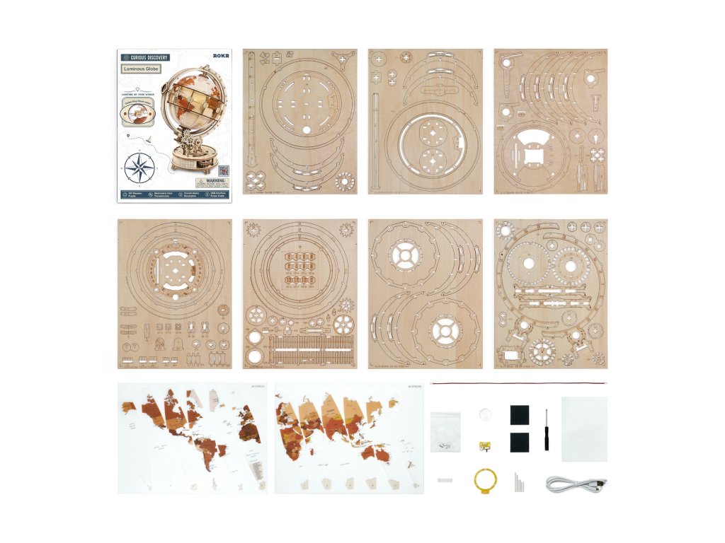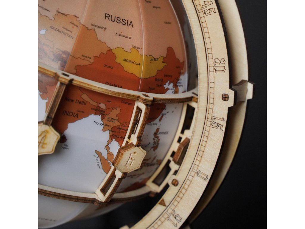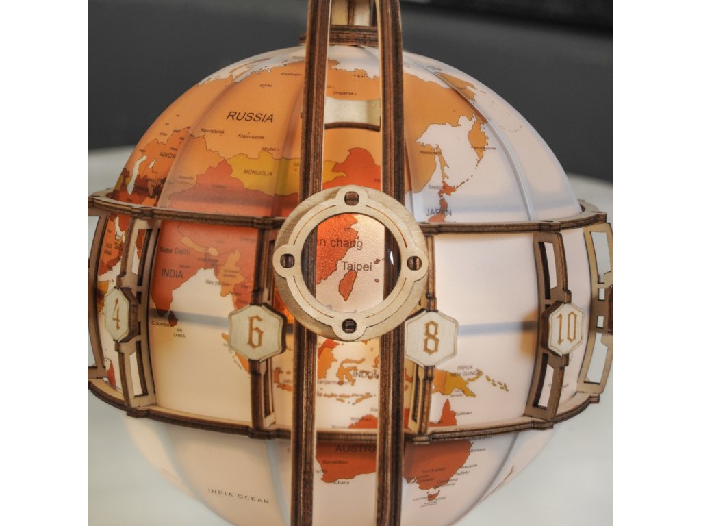 Díky stavebnici glóbu z překližky se neztratíte ve světě, a to ani v noci! Prostřednictvím jeho stavby můžete dát odpočinout své mysli od každodenního shonu, prověřit své dovednosti, trpělivost a schopnost soustředění. Výsledný model můžete využít jako atraktivní noční lampičku, pro tento účel je uvnitř vybaven LED světelným zdrojem o nízké spotřebě, s nenápadným vypínačem a napájením v podobě rozšířeného microUSB, či USB‑A konektoru. Glóbem je možno otáčet prostřednictvím částečně odhalené a poutavě zpracované soustavy převodů. Na svém obvodu je opatřen také mechanicky ovládanou lupou, s pomocí které přečtete i nejdrobnější nápisy na jeho povrchu. Členitá konstrukce je vyvedena v retro stylu, zdobí ji četné ornamenty, ale také stupnice k určování zeměpisné polohy, nebo označení časových pásem. Skládačka je dodávána v nesloženém stavu, balena v krabici. Vybaveno detailním návodem k sestavení.