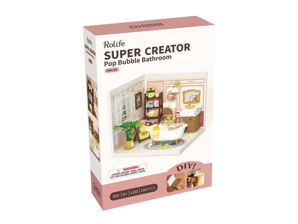 Představte si, jak si po náročném dni plném práce napustíte horkou vanu, připravíte si voňavou pěnivou koupel a užíváte si pocit pohody a uvolnění. Koupelna v kombinaci pastelově růžové a bílé barvy s vanou se zlatými nožičkami, toaletou s „usmívajícím se“ víkem a dalšími stylovými doplňky je kompletně vybavená všemi potřebnými drobnostmi, jako je fén, ručníky, bačkůrky a další nezbytnosti, např. roztomilá žlutá kachnička, noviny ke čtení i potřeby pro praní. Spojením různých miniatur řady Super Creator Series vertikálně nebo horizontálně můžete vytvořit různorodý komplex domečků. Ochraňte svůj výtvor pomocí krytů proti prachu a nečistotám – DWP05 Dveře proti prachu B a DWP02 Střecha typu B.