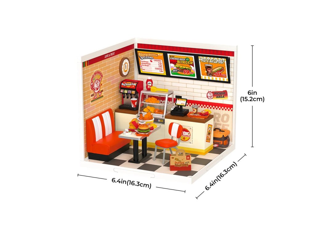 Máte rádi burgery? Užijte si nostalgickou atmosféru klasického rychlého občerstvení s nabídkou hamburgerů, hranolek, kuřecího masa, koblih a dalších dobrot. Poskládejte si restauraci s obslužným pultem a posezením vybavenou do nejmenších detailů včetně vitríny, nápojového automatu, smažených kuřecích kousků, kelímku a spoustu dalších doplňků. Spojením různých miniatur řady Super Creator Series vertikálně nebo horizontálně můžete vytvořit různorodý komplex domečků.