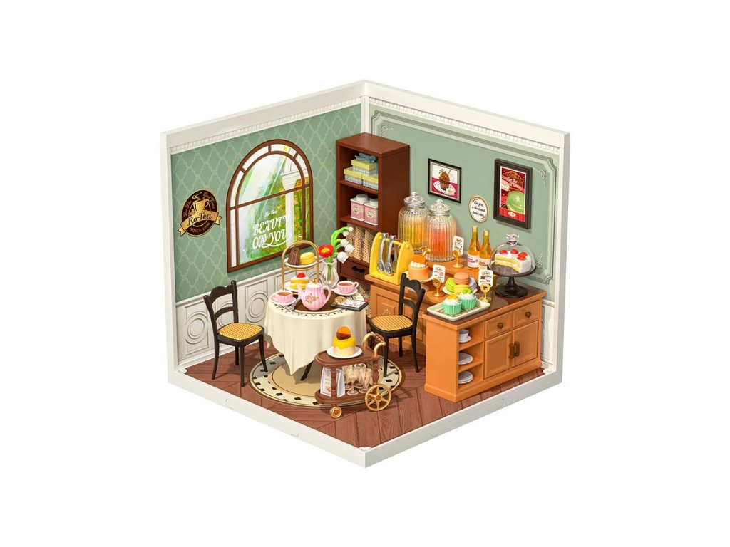 Máte chuť na čaj? Vítejte ve stylové vintage čajovně se zelenkavými stěnami se starožitným vybavením a detaily, jako jsou posezení s kulatým stolkem s krajkovým ubrusem, hrnečky, talířky, sladkosti a mnoho dalšího. Vychutnejte si atmosféru klidu umocněnou vůní čerstvě uvařeného čaje a upečených dobrot. Spojením různých miniatur řady Super Creator Series vertikálně nebo horizontálně můžete vytvořit různorodý komplex domečků. Ochraňte svůj výtvor pomocí krytů proti prachu a nečistotám – DWP05 Dveře proti prachu B a DWP02 Střecha typu B.