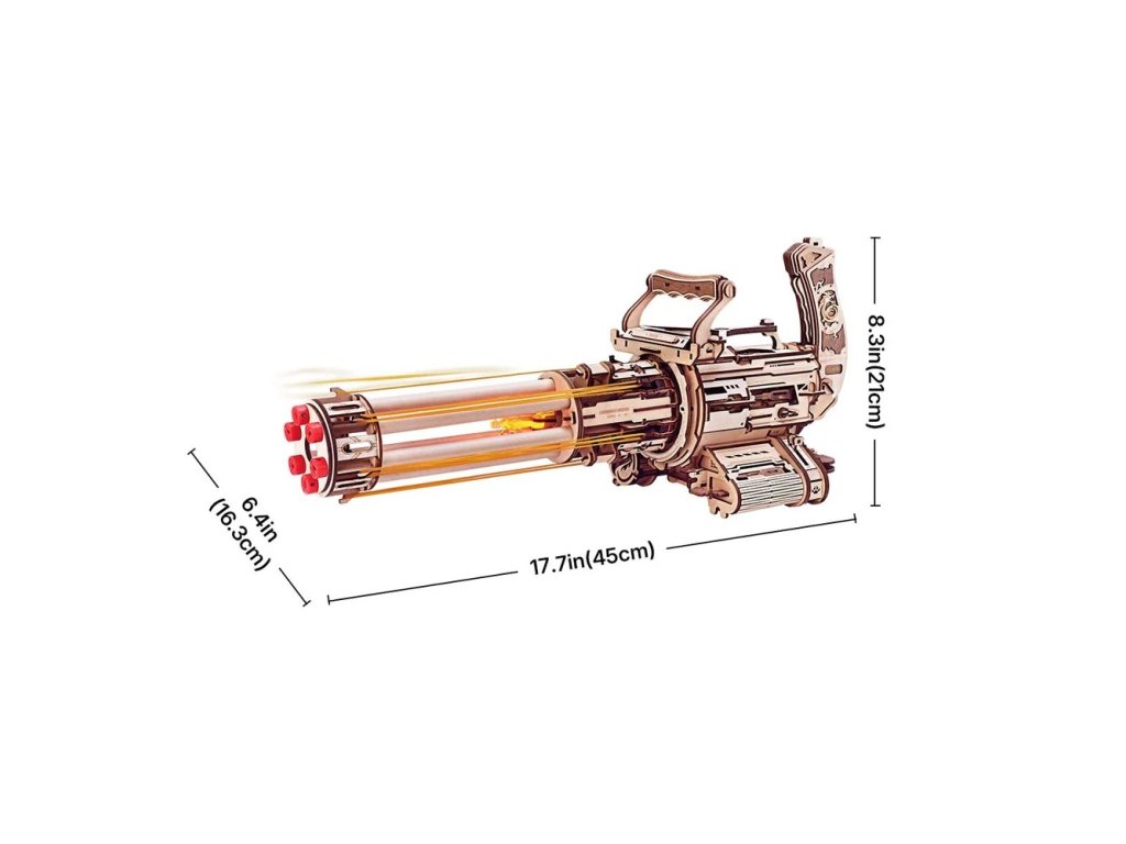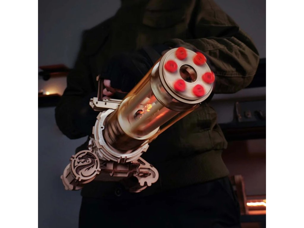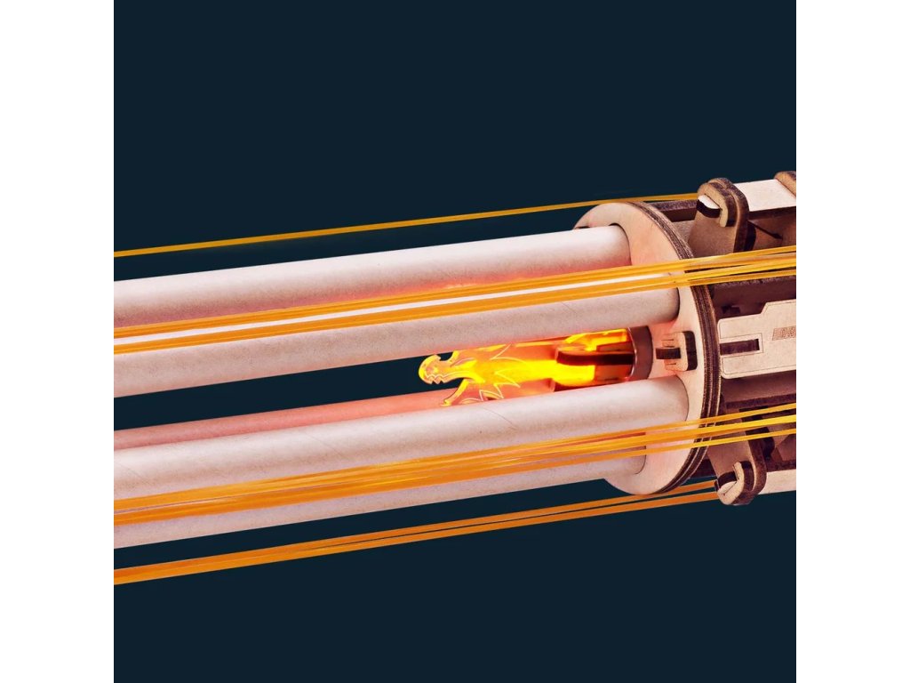 Připravit, sestavit, zaměřit, střílet! Rozprouděte si krev. Máte dostatek adrenalinu pro tuto otočnou, cvakající a střílející obouruční zbraň? Kulomet s otočnou hlavní ROKR je 3D dřevěná puzzle zbraň, jejímž vrcholem je šest otočných hlavní, z nichž každá dokáže vystřelit šest gumiček. To je 36 vysokorychlostních ran, které můžete nabít na odnímatelnou sestavu otočné hlavně. Tato kráska, inspirovaná modelem XM556, naučí fanoušky leccos o mechanice rotačních kulometů, aniž by přitom měla masivní hmotnost. Také se vyhýbá zranění živých cílů tím, že jako střely používá gumičky. Staňte se svým vlastním akčním hrdinou a objednejte si ten svůj ještě dnes! Tato stavebnice technického modelu je skvělým prvkem v jakékoli sbírce, ať už jde o vystavení nebo jako dárek pro nadšence do hraček a filmů či vojenské veterány po celém světě. Šestihlavňový kanón má jednoosý synchronizovaný systém řízení palby, který jako munici používá gumové pásy. Každá ze šesti hlavní pojme šest gumových pásů pro celkem 36 výstřelů, poháněných účinným převodovým mechanismem. Pro rovnoměrné napnutí a plynulou střelbu vkládejte munici jednu po druhé a otáčejte hlavní, dokud všechny hlavně nebudou mít 6 gumiček. Přední spoušť otáčí hlavní a světlem ohnivého draka, zatímco horní spoušť spouští gumičky pro dvojnásobnou zábavu a akci.