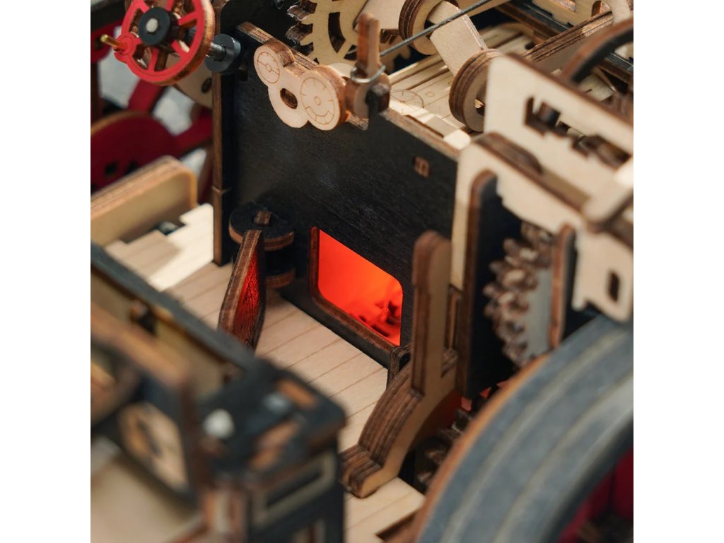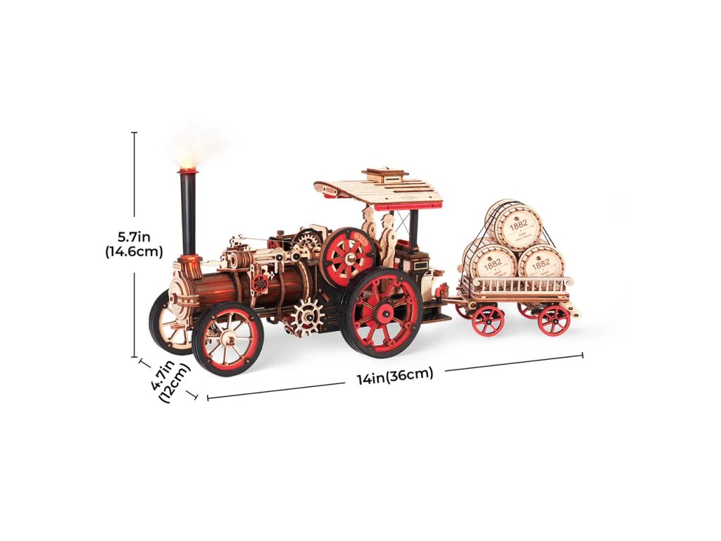 Skládačka parního stroje prověří Vaše konstruktérské dovednosti. Vytvořte si repliku jednoho z prvních parních vozidel v měřítku 1:28. Parní stroj je vybaven miniaturním, ale účinným motorem dostatečně silným, aby poháněl vůz dopředu nebo dozadu i s plným přívěsem. Je vybaven manuální převodovkou se třemi rychlostmi, s možností jízdy vpřed (pomalu a rychle) nebo vzad. Má sklopnou sluneční clonu, otočný volant a silikonová kola. Připojte odpružený přívěs otočný o 120° a jste připraveni přepravit svůj náklad kamkoli. V topeništi a komíně jsou umístěna světla, aby napodobovala proces spalování a z komína „vychází“ kouř. Speciální efekty umocní dojem z provozu tohoto atraktivního a propracovaného parního stroje. Spolu s parním strojem s přívěsem je v balení také dobová lampa a lavička. Stroj vyžaduje 2 kusy baterií AAA/LR03/AM4 1,5V, které nejsou součástí balení. Skládačka je dodávána v nesloženém stavu, zabalená v krabici s podrobným návodem k sestavení.