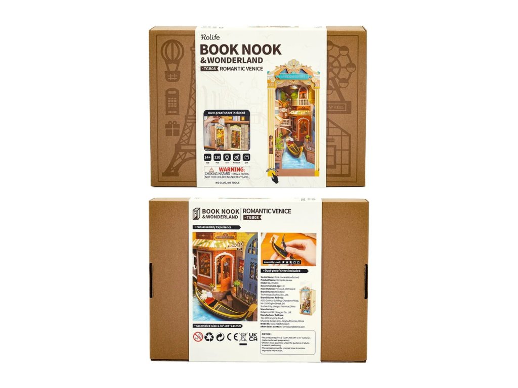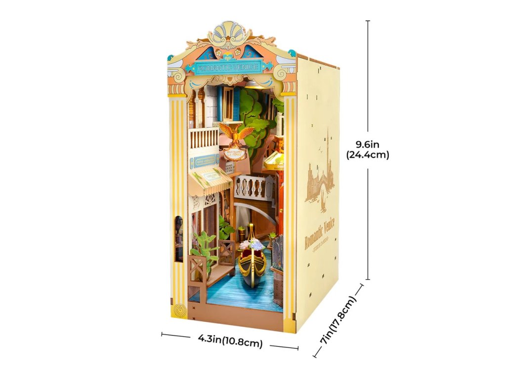 Kousek italského životního stylu a historie u Vás doma. Vneste kousek Itálie mezi své knihy. Představte si romantickou projížďku lodí Benátským kanálem mezi italskými památkami. Toto DIY puzzle vám umožní vlastnit kousek města, protože zobrazuje proslulou gondolu, Canal Grande, Teatro La Fenice, obchod s maskami a kavárnu. Zarážka na knihy byla navržena s takovou precizností a autenticitou, že zachycuje klid města v malém knižním koutku. Benátský kanál je úžasně vyobrazen pomocí průhledného plastu, díky kterému je vodní efekt realističtější. A tento nádherný pohled ještě umocňuje LED osvětlení. Tato zarážka na knihy je z přední i horní strany chráněna před prachem a nečistotami průhlednou fólií. Zacvakávací díly usnadňují identifikaci při jejich skládání. Ideální dárek pro zvláštní příležitost nebo vhodné jako dekorační předmět do Vaší knihovny. Osvětlení pomocí LED je ovládáno moderním dotykovým spínačem a všechny jeho součásti jsou přizpůsobeny ke snadné vestavbě. Mikrotužkové baterie potřebné k napájení nejsou součástí stavebnice. Dodáváno s podrobným návodem k sestavení.