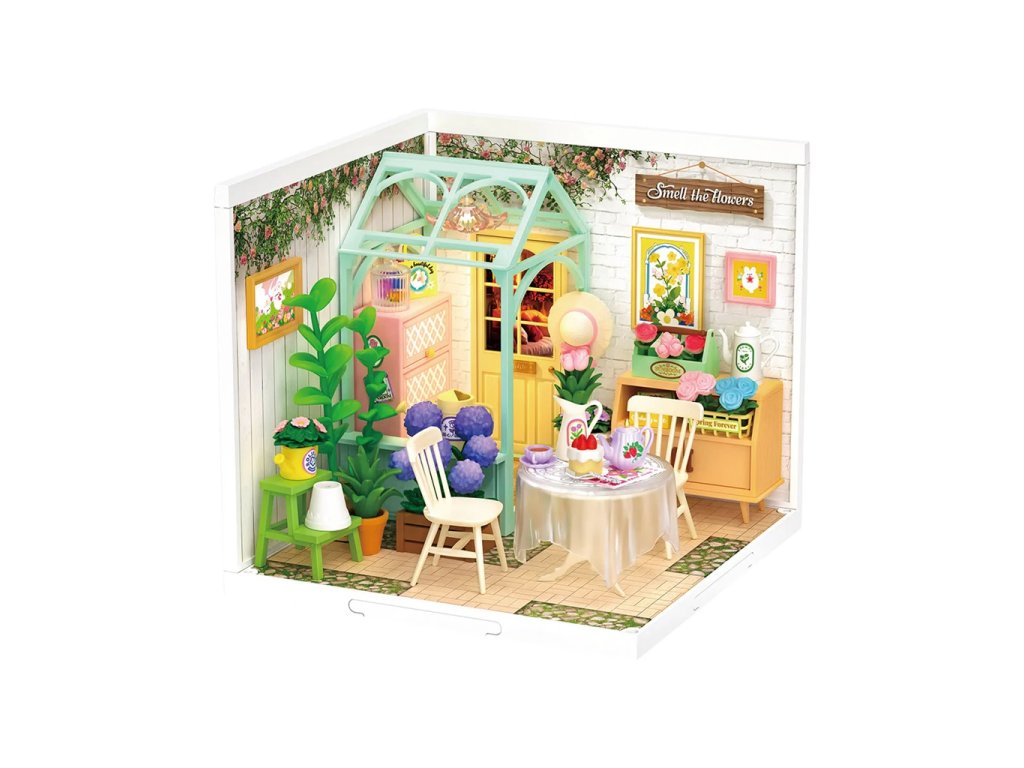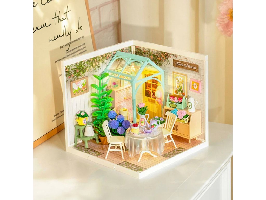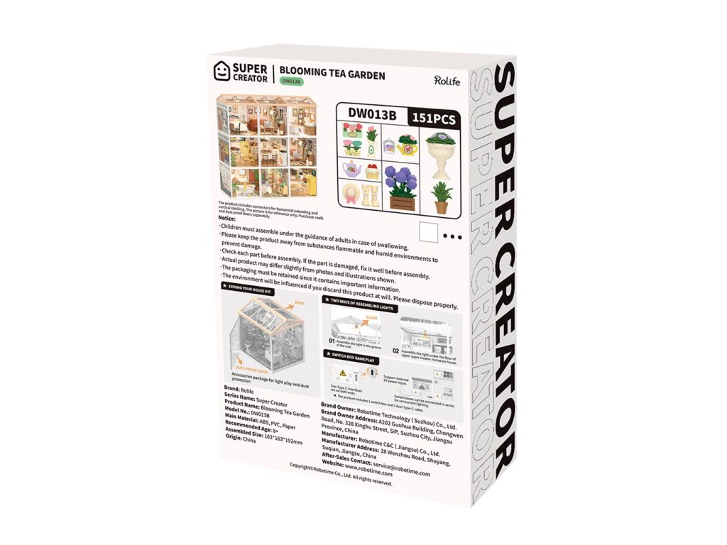 Navštivte zahradu se spoustou květin, kde byste mohli relaxovat, přemýšlet či si přečíst knihu, obdivovat vůni a barvy rozmanitých květin a popíjet svůj oblíbený čaj. Veškerý nábytek a doplňky včetně čajového stolku, květinových aranžmá, zelených rostlin či dveří je realisticky ztvárněn v živých barvách do nejmenších detailů. Toto příjemné zákoutí Vás naplní pocitem pohody a klidu. Spojením různých miniatur řady Super Creator Series vertikálně nebo horizontálně můžete vytvořit různorodý komplex domečků. Ochraňte svůj výtvor pomocí krytů proti prachu a nečistotám – DWP05 Dveře proti prachu B a DWP02 Střecha typu B.