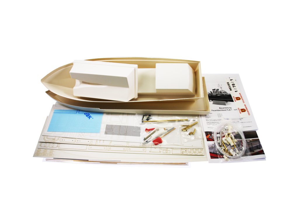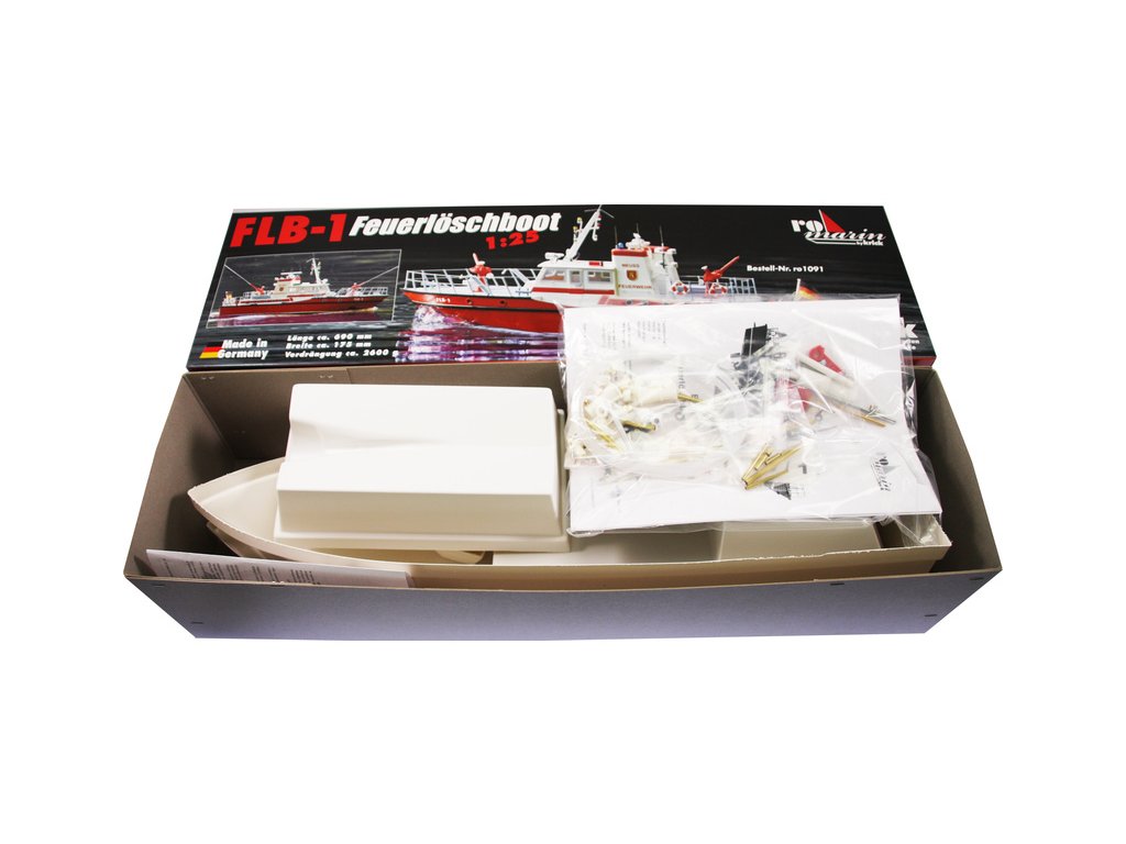 Stavebnice RC modelu lodi na dálkové ovládání od firmy ROMARIN, hasičská loď FLB-1 kit. Vzorem loď FLB-1 na řece Rýn, pro účely požární a záchranné služby. Obsahuje plastové díly trupu a paluby a interiéru, dřevěné součásti, výkres, lodní šroub, maketové díly a drobné stavební příslušenství.