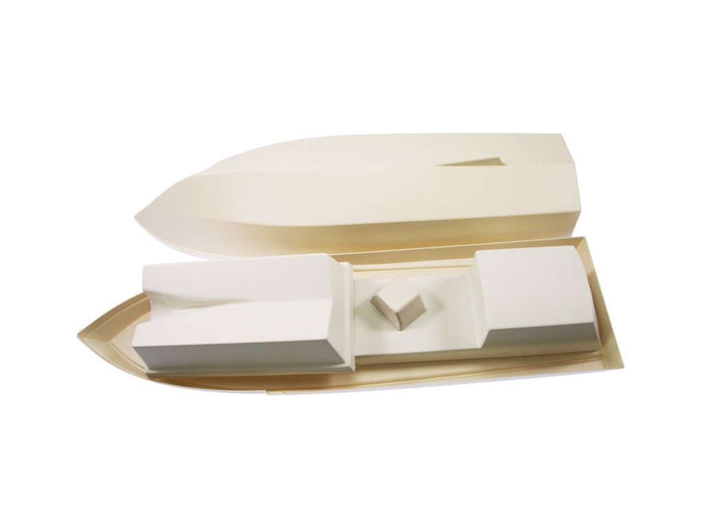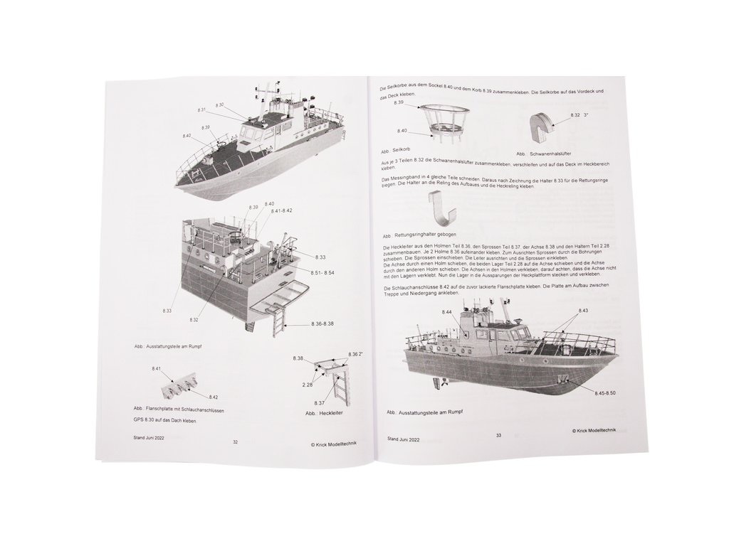Stavebnice modelu lodi ROMARIN, hasičská loď FLB-1, obsahuje lisovaný trup z ABS plastu, laserem řezané části paluby a nástavby, díly paluby a interiéru, záďovou trubku s hřídelí, spojkou a lodním šroubem, maketové díly a drobné stavební příslušenství, německý manuál s obrázky a český překlad.