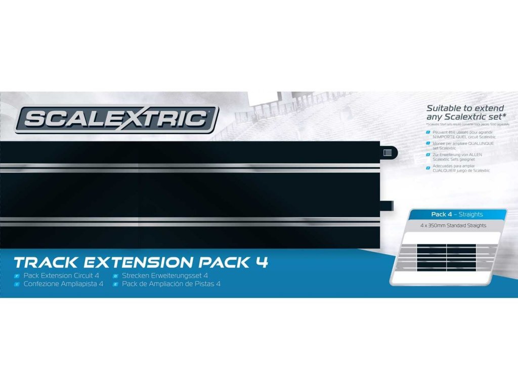 Rozšíření k autodráze Scalextric.Rozšíření pro autodráhy Scalextric - rovné díly. Velikost: 4x 350 mm - rovný díl.