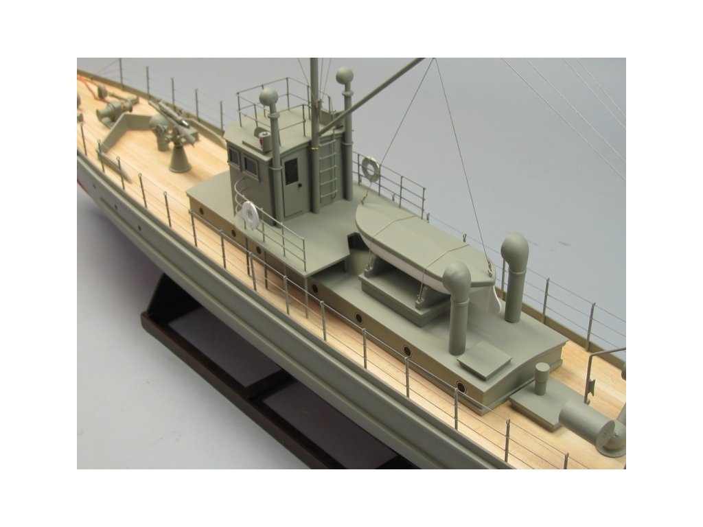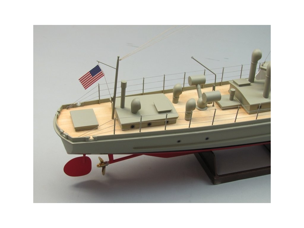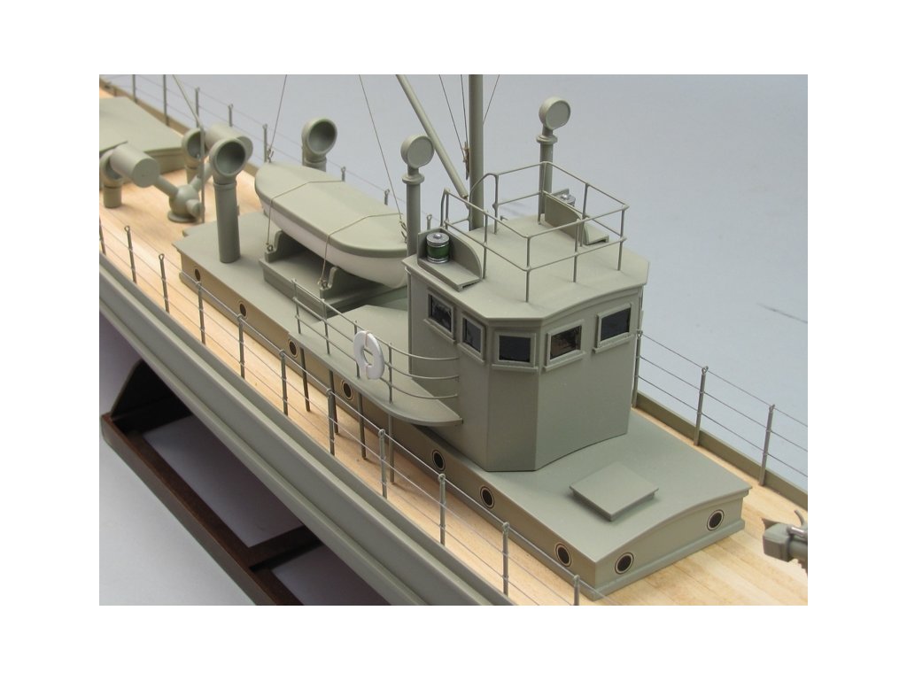 Stavebnice amerického stíhače ponorek v rozsypu v měřítku 1:35 pro pohon elektromotorem řady pro mírně pokročilé stavitele. Díky vysokému předpracování většiny dílů není stavba nijak zvlášť náročná na zručnost a dílenské vybavení - ale samozřejmě pečlivá a trpělivá práce je v lodním stavitelství nezbytná pro dosažení dobrého výsledku. Pro lepení budete potřebovat střední a husté vteřinové lepidlo, "acetonové" modelářské lepidlo, epoxid a lepidlo pro lepení plastikových modelů. Vlastní stavba probíhá dle perspektivních výkresů zobrazujících detailně konstrukci dané části lodi, pro vybrané klíčové kroky (jako je stavba kostry trupu) slouží stavební přípravky z předseknutých překližkových dílů. Zhotovování doplňků jako jsou třeba žebříky usnadňují předtištěné šablony v měřítku 1:1.