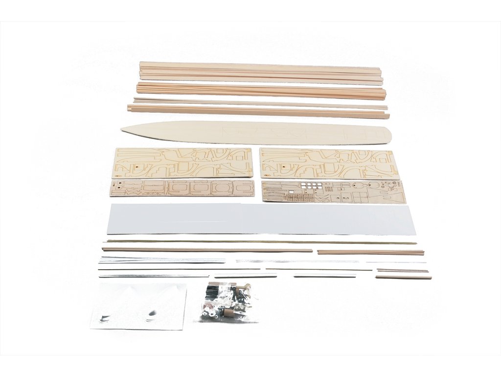 Trup je tvořen (stejně jako u skutečné lodi) kostrou, jejíž páteř tvoří kýl s nalepenými žebry - všechny díly jsou překližkové, vyřezávané laserem; stavební přípravky zaručující správné sestavení kostry jsou předseknuté. Obšívka trupu je tvořena balsovými lištami - použití měkkého dřeva usnadňuje ohýbání a tvarování planěk (bez nutnosti namáčení) i jejich následné broušení. Pro dosažení složitějších tvarů ale samozřejmě budete muset sáhnout po namáčení (ve zředěné čpavkové vodě 1:1 za studena nebo v horké vodě s přídavkem tekutého avivážního prostředku) - ale díky promyšlené konstrukci lodi jen vyjímečně. Paluba je překližková a nástavba je z vakuově lisovaných plastových dílů s balsovou a překližkovou kostrou z laserem vyřezávaných dílů.
