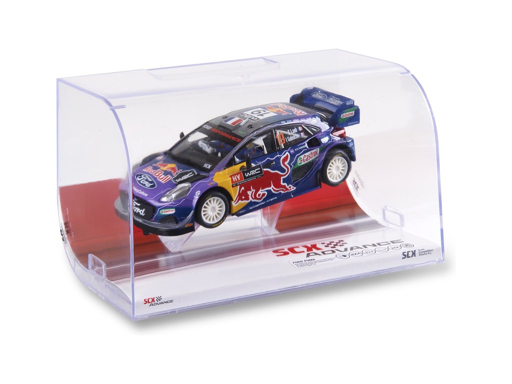 Dráhové autíčko SCX Advance Ford Puma Rally WRC Loeb (náhon 4WD) v měřítku 1:32, verze 2.0, pro digitální autodráhy SCX Advance. Autíčko je vybaveno LED osvětlením. Na podvozku se nachází přepínač digital / analog - autíčko lze tedy používat na digitální autodráze SCX Advance i na analogové autodráze SCX Original.