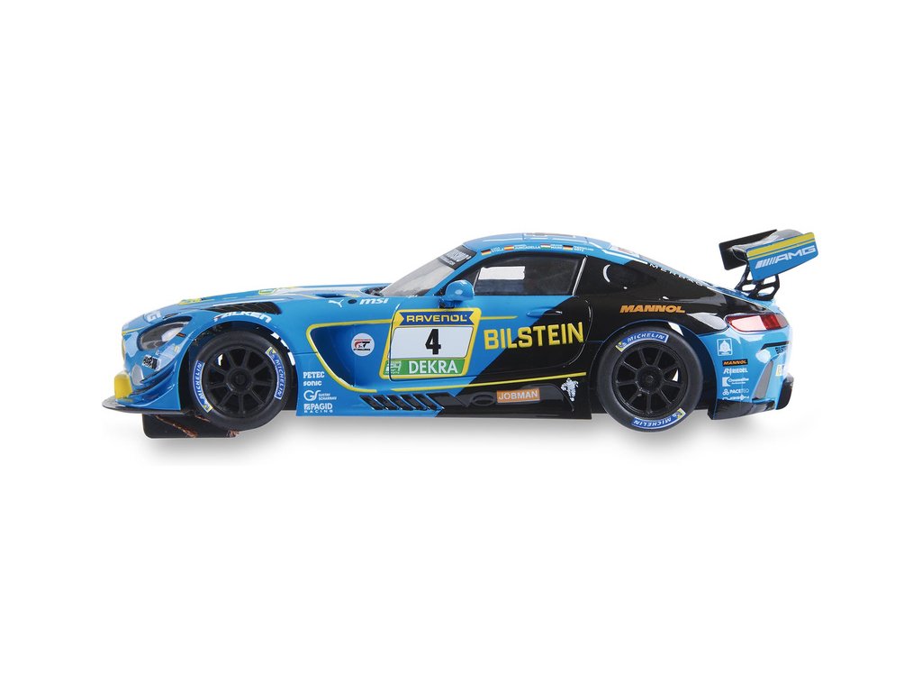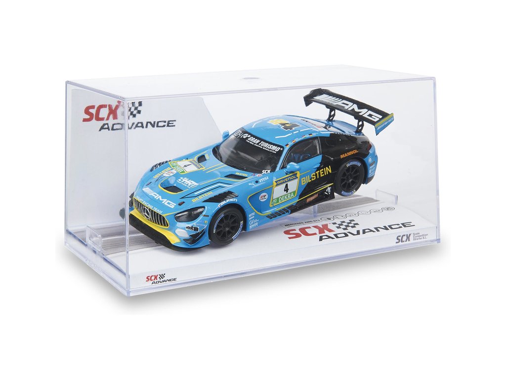 Dráhové autíčko SCX Advance Mercedes AMG GT3 Bilstein v měřítku 1:32, verze 2.0, pro digitální autodráhy SCX Advance. Autíčko je vybaveno LED osvětlením. Na podvozku se nachází přepínač digital / analog - autíčko lze tedy používat na digitální autodráze SCX Advance i na analogové autodráze SCX Original.