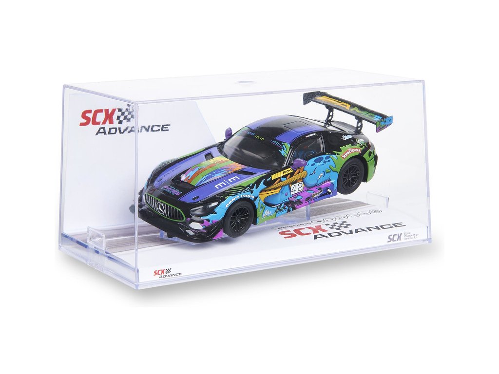Dráhové autíčko SCX Advance Mercedes AMG GT3 Makes & Models v měřítku 1:32, verze 2.0, pro digitální autodráhy SCX Advance. Autíčko je vybaveno LED osvětlením. Na podvozku se nachází přepínač digital / analog - autíčko lze tedy používat na digitální autodráze SCX Advance i na analogové autodráze SCX Original.