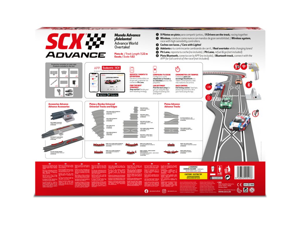 Autodráhy SCX Advance jsou digitální, což umožňuje na rozdíl od klasické analogové autodráhy vzájemné předjíždění a mnoho dalších funkcí. Měřítko 1:32 je ideální velikost pro pravé a napínavé závody při kterých si plně užijete a osvojíte dynamiku autíček. Autodráhy SCX 1:32 mají shodné traťové díly a lze autodráhu vylepšovat a rozšiřovat. Autodráhy SCX Advance lze navíc pomocí tuningové Bluetooth rovinky (prodává se samostatně) spojit s telefonem či tabletem. V telefonu pak budete mít k dispozici počítadlo kol, tvorbu závodů, nastavení autíček, nebo zde můžete sdílet výsledky. Pokud ještě Bluetooth rovinku doplníte o boxovou uličku, můžete prožívat napínavé závody s úbytkem paliva a tankováním.