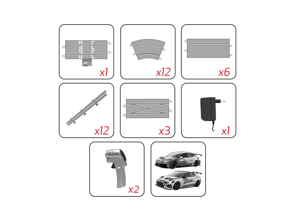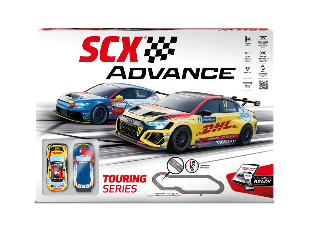 Elektrická závodní autodráha SCX Advance Touring Series v klasickém měřítku 1:32 pro napínavější závody - vynikající digitální autodráha s možností předjížděním v křížení (ovladačem řízená výhybka) a svodidly. Balení obsahuje dva bezdrátové ovladače s přepínačem výhybky, dvě detailně zpracovaná digitální dráhová autíčka AUDI RS' LMS TCR - DHL a CUPRA LEON COMPETICION - J. FILIPPI, která jsou vybavena LED světly. Plocha pro rozložení: 288 x 126 cm. Složení tratě je velmi snadné, jednotlivé traťové díly zacvaknete do sebe, spárujete ovladače s autíčky a můžete začít závodit.