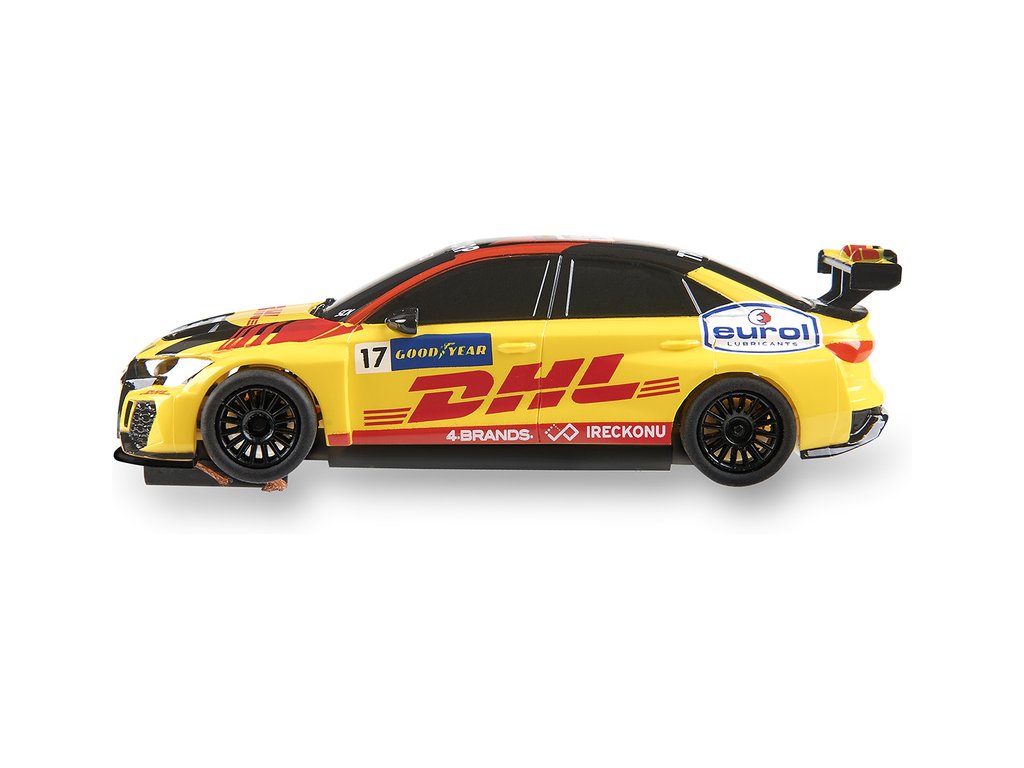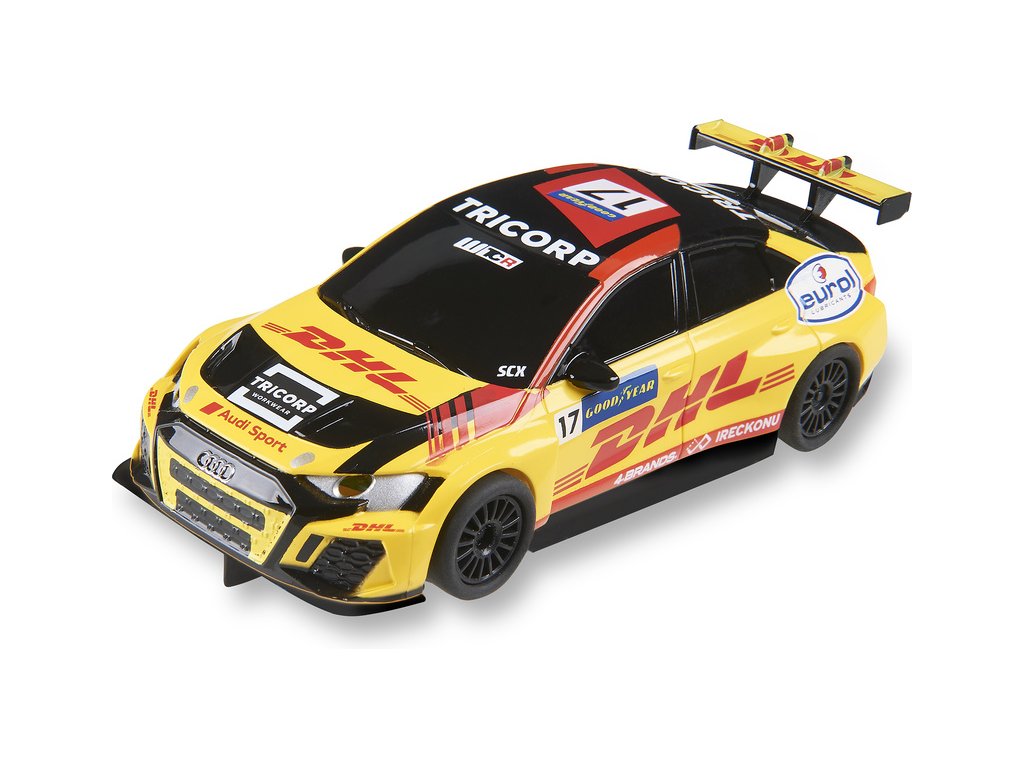 Dráhové autíčko SCX Compact Audi RS3 LMS TCR Berthon v měřítku 1:43, pro autodráhy SCX Compact. Autíčko je vybaveno LED světly.