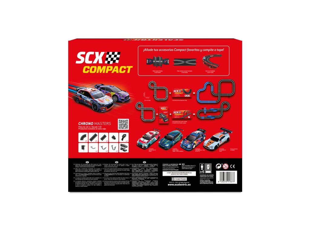 Autodráha SCX Compact Chrono Masters v měřítku 1:43 - analogová elektrická autodráha s rovinkami, zatáčkami a mostem. Dva bezdrátové ovladače, dvě detailní dráhová autíčka se světly, Ford Ford Puma Rally 1 WRC Montecarlo a Hyundai Hyundai i-20 WRC. Plocha pro rozložení základní varianty: 114 x 114 cm. Délka tratě: 3,6 m. Složení tratě je velmi snadné, jednotlivé traťové díly zacvaknete do sebe, připojíte ovladače a můžete začít závodit.