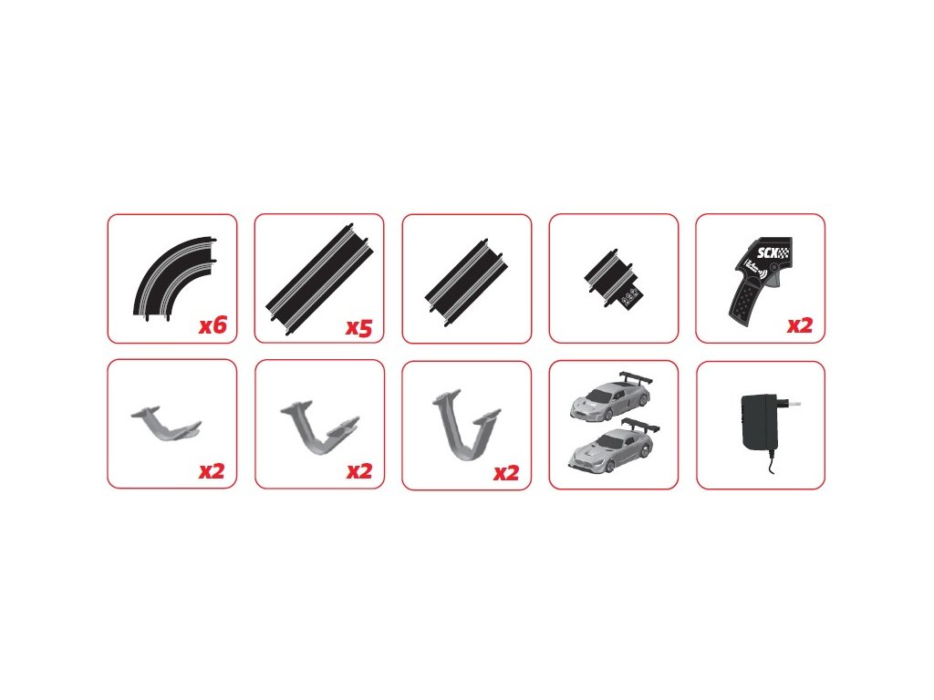Balení obsahuje traťové díly, most, 2x dráhové autíčko, 2x ovladač a napájecí zdroj.