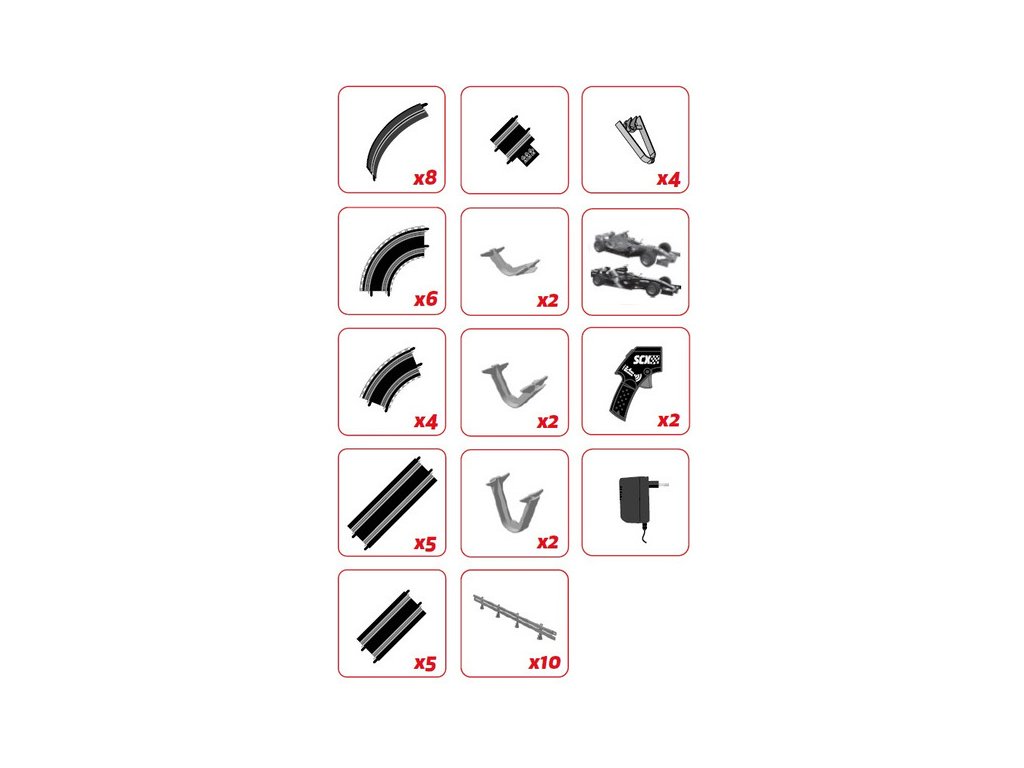 Balení obsahuje traťové díly, most, svodidla, dvojitý looping, 2x dráhové autíčko, 2x ovladač a napájecí zdroj.