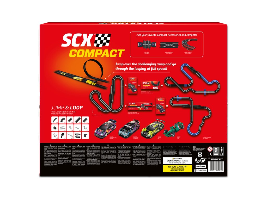 Autodráha SCX Compact Jump & Loop v měřítku 1:43 - analogová elektrická autodráha s rovinkami, zatáčkami, mostem, svodidly, barevnými obrubníky, dvojitým loopingem a skokánky. Dva bezdrátové ovladače, dvě detailní dráhová autíčka se světly, Cupra E-Racer Tambay a Porsche 911 GT3. Plocha pro rozložení základní varianty: 148 x 82 cm. Délka tratě: 6,6 m. Složení tratě je velmi snadné, jednotlivé traťové díly zacvaknete do sebe, připojíte ovladače a můžete začít závodit.