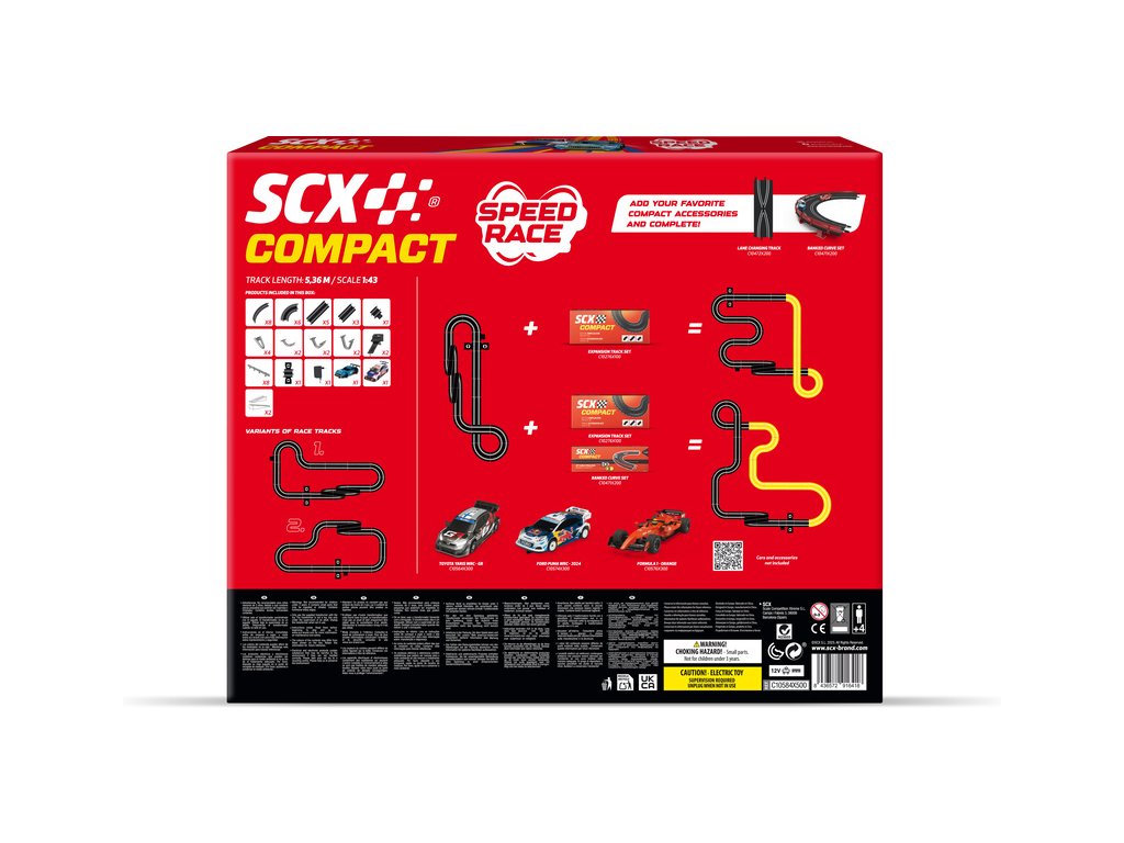 Autodráha SCX Compact Speed Race v měřítku 1:43 - analogová autodráha s mostem, svodidly, 2x loopingem, skokánkem a počítadlem kol. Dva ergonomické ovladače, dvě detailní dráhová autíčka se světly, Audi RS3 a Mercedes-Benz AMG GT3. Plocha pro rozložení základní varianty: 180 x 80 cm. Délka tratě: 5,36 m. Složení tratě je velmi snadné, jednotlivé traťové díly zacvaknete do sebe, připojíte ovladače a můžete začít závodit.