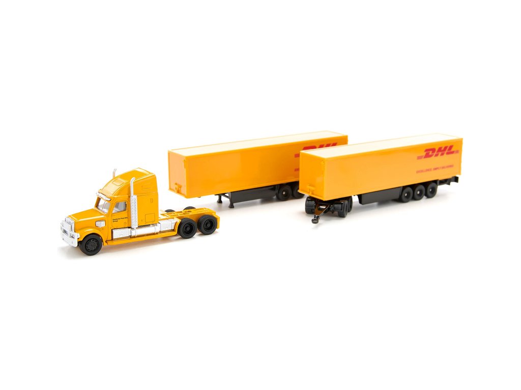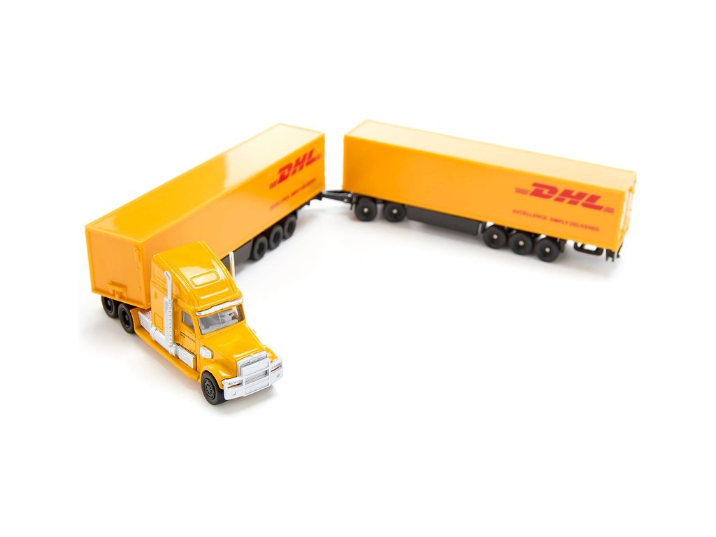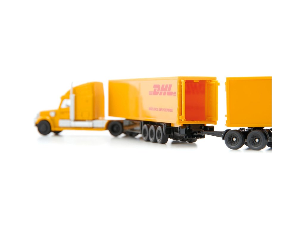 Kovový model kamionu s návěsem a přívěsem DHL v měřítku 1:87 od značky Siku. Model má detailní zpracování, chromované prvky na tahači, přívěs a návěs mají otevírací dveře, pogumované pneumatiky. Vhodné pro hraní i sběratelství. Kvalitní zpracování z kovu a plastu.