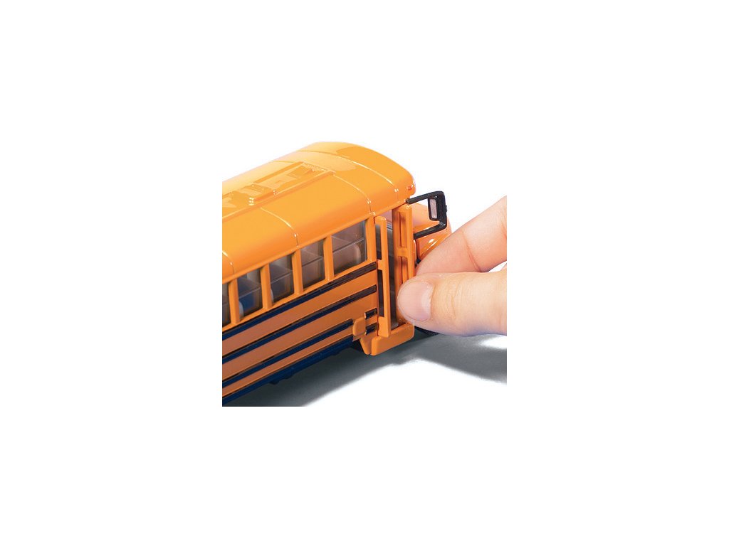 Kovový model klasické žlutého školní autobus v měřítku 1:50. Má otevírací boční dveře, odklopnou kapotu, interiér se sedačkami a boční vyklápěcí značku stop. Vhodné pro hraní i sběratelství. Kvalitní zpracování z kovu a plastu.