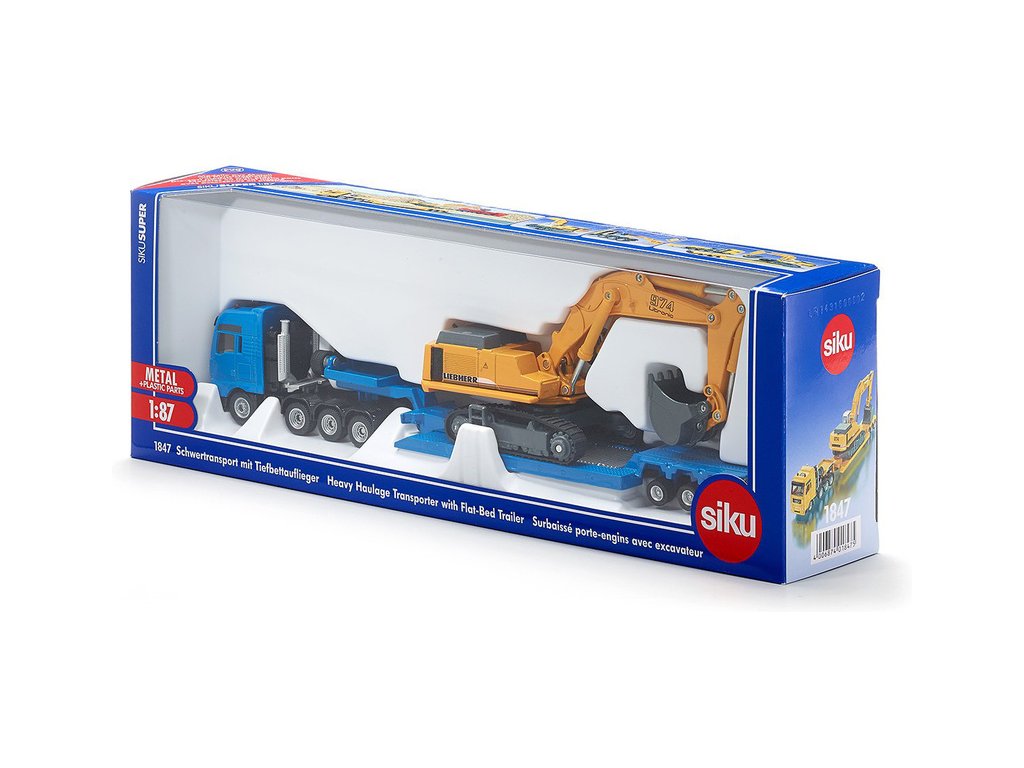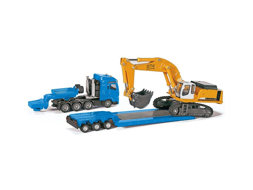 Kovový model tahače MAN TG-A s podvalníkem a rypadlem Liebherr v měřítku 1:87 od značky Siku. Model obsahuje gumové pneumatiky, odpojitelný návěs, rypadlo má otočnou nádstavbu, pohyblivé rameno se lžící a funkční makety pístů. Vhodné pro hraní i sběratelství. Kvalitní zpracování z kovu a plastu.