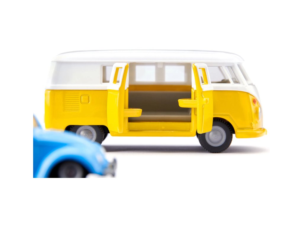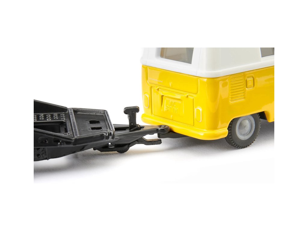 Kovový model minivanu Volkswagen T1 s přívěsným vozíkem a modelem Beetle v měřítku 1:50. Dva legendární modely v jedné funkční sadě. Volkswagen T1 má otevírací dveře na pravé straně, přívěs je odpojitelný, kola jsou gumová. Vhodné pro hraní i sběratelství. Kvalitní zpracování z kovu a plastu.