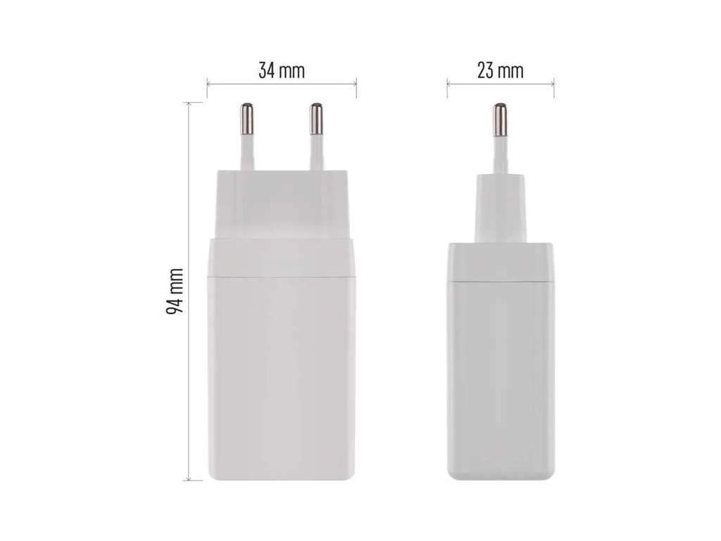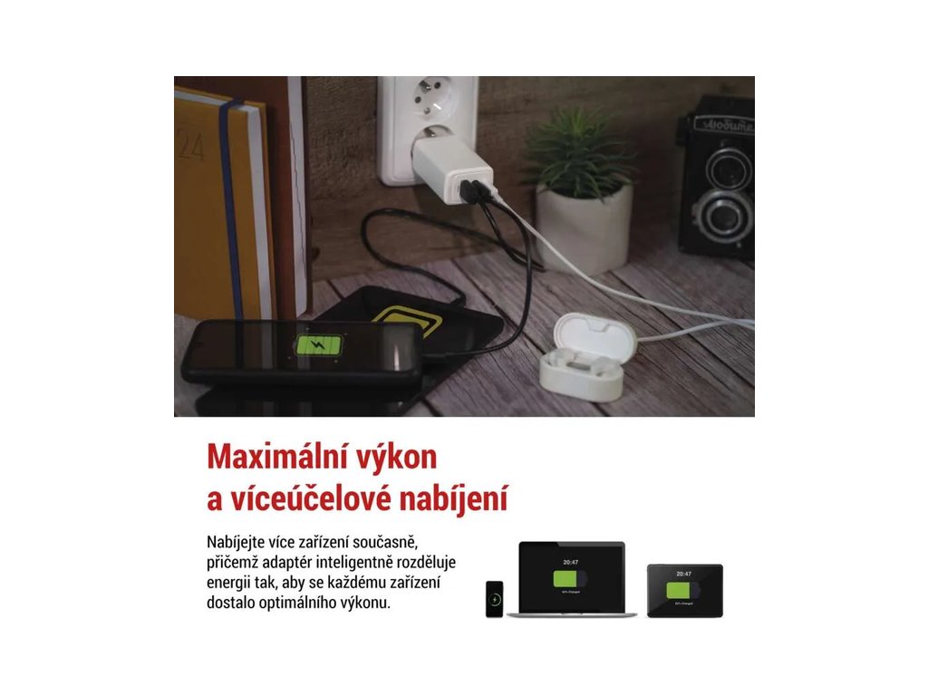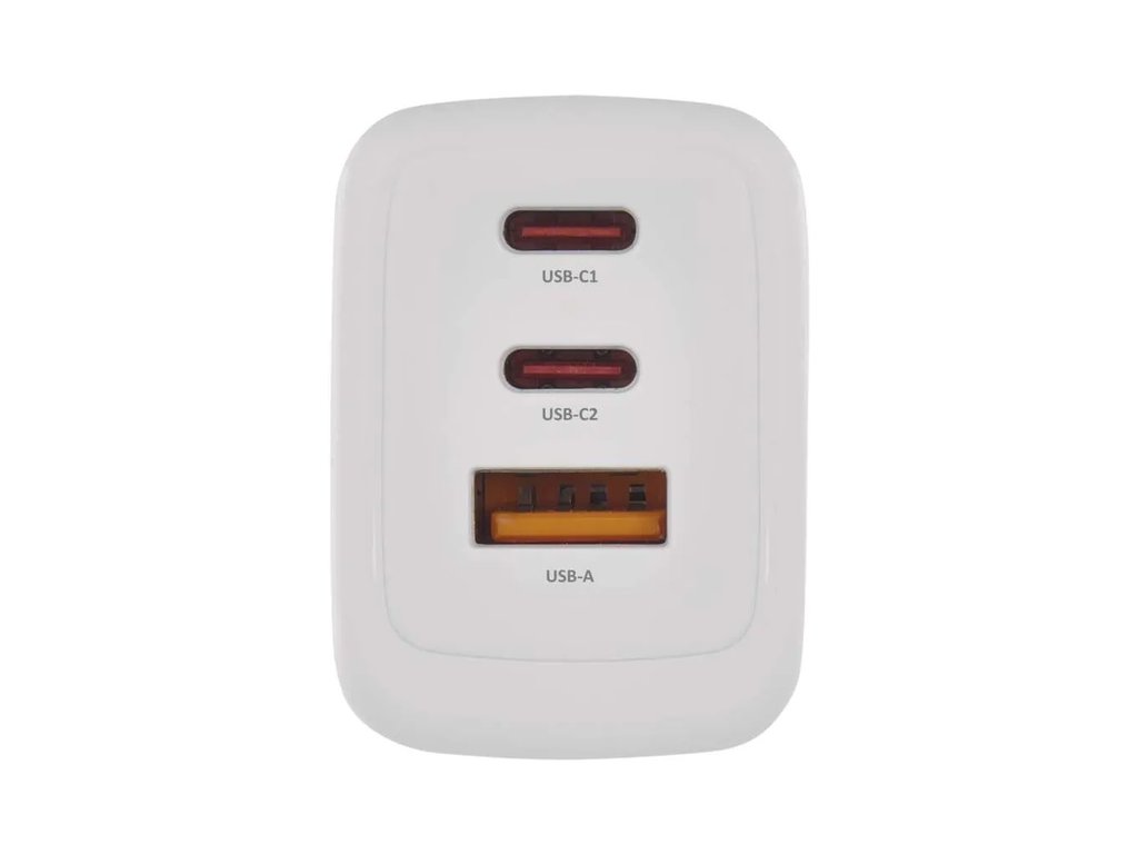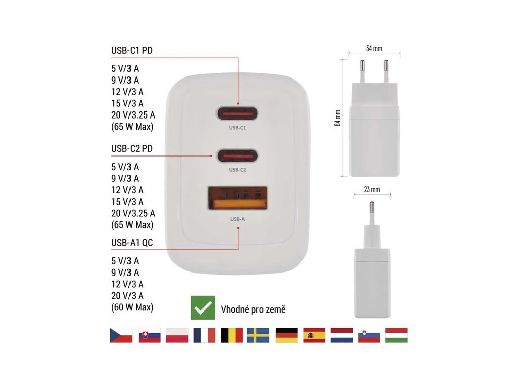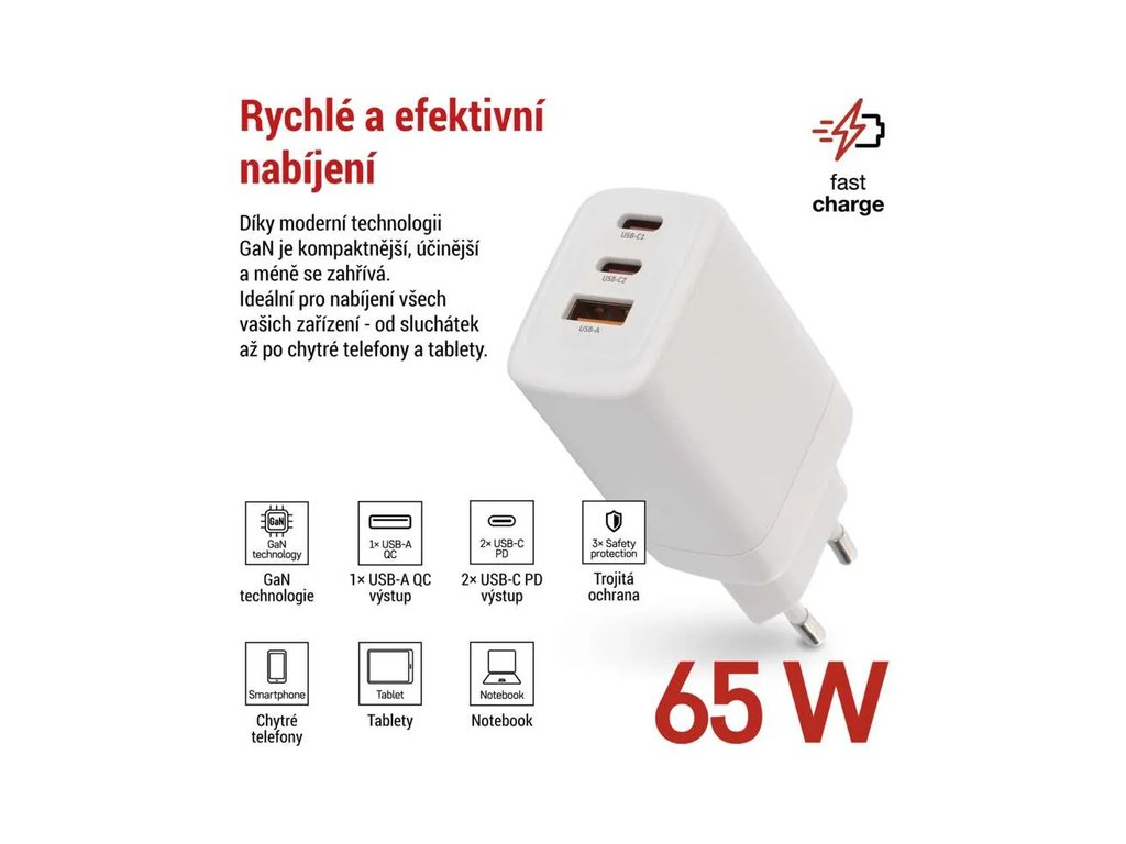 Výkonný univerzální síťový adaptér USB s výkonem až 65W a třemi výstupy - 1x USB‑A (klasický), 2x USB‑C. Adaptér zajistí rychlé a spolehlivé nabíjení a napájení telefonů, tabletů, notebooků, USB nabíječů a dalších zařízení. Tranzistory s Nitridem Galia poskytují vysokou účinnost při zachování kompaktních rozměrů. Automatické a efektivní rozdělení výkonu na jednotlivé výstupy dle požadavků připojených zařízení.