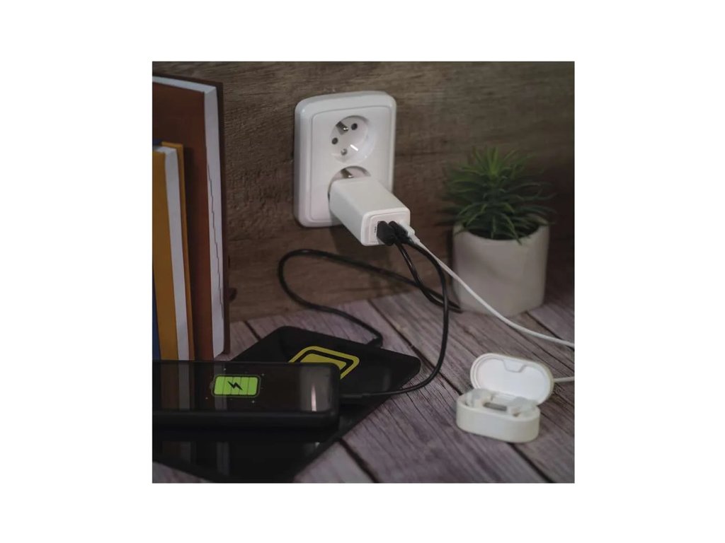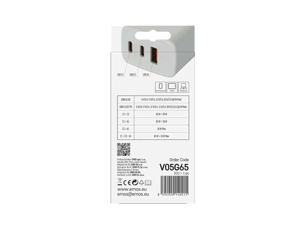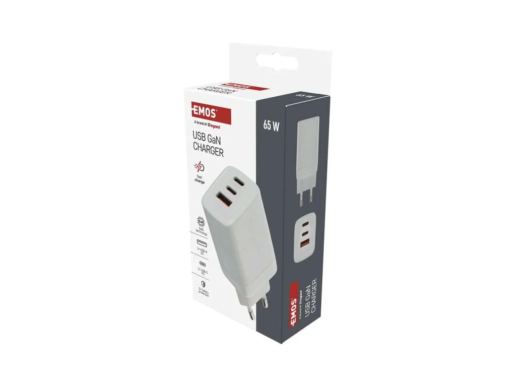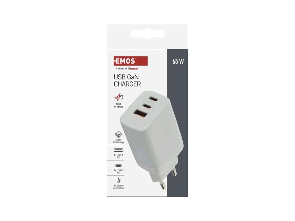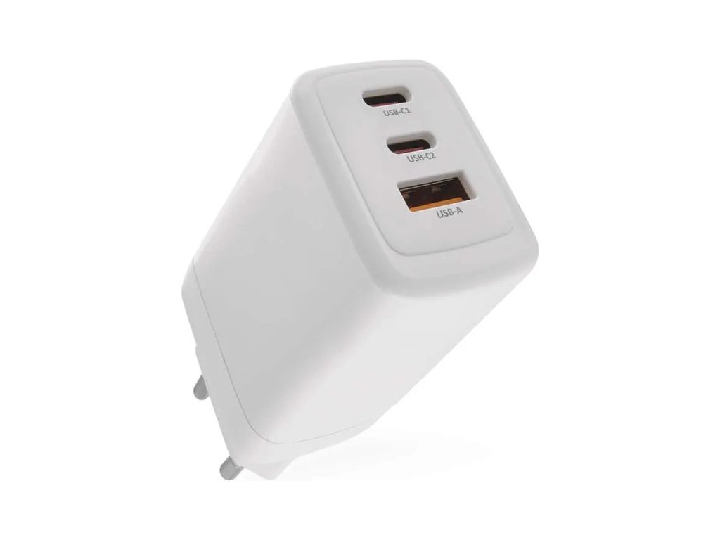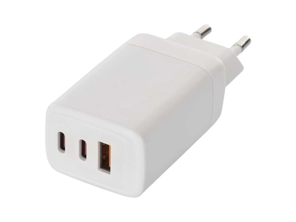 Výkonný univerzální síťový adaptér USB s výkonem až 65W a třemi výstupy - 1x USB‑A (klasický), 2x USB‑C. Adaptér zajistí rychlé a spolehlivé nabíjení a napájení telefonů, tabletů, notebooků, USB nabíječů a dalších zařízení. Tranzistory s Nitridem Galia poskytují vysokou účinnost při zachování kompaktních rozměrů. Automatické a efektivní rozdělení výkonu na jednotlivé výstupy dle požadavků připojených zařízení.