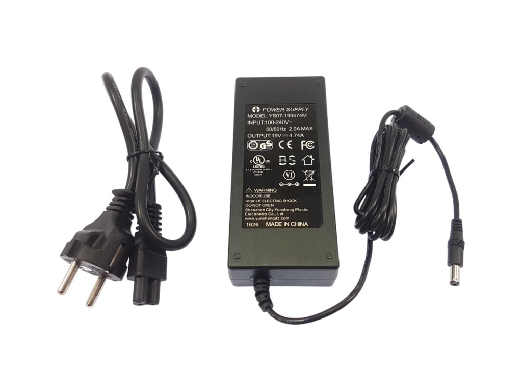 Spínaný stabilizovaný síťový zdroj 19V 4.7A pro napájení nejrůznější elektroniky. Výstup je tvořen DC konektorem o vnějším průměru 5.5 mm a otvorem 2.1 mm pro kolík s polaritou +. Součástí balení je síťový kabel s vidlicí.