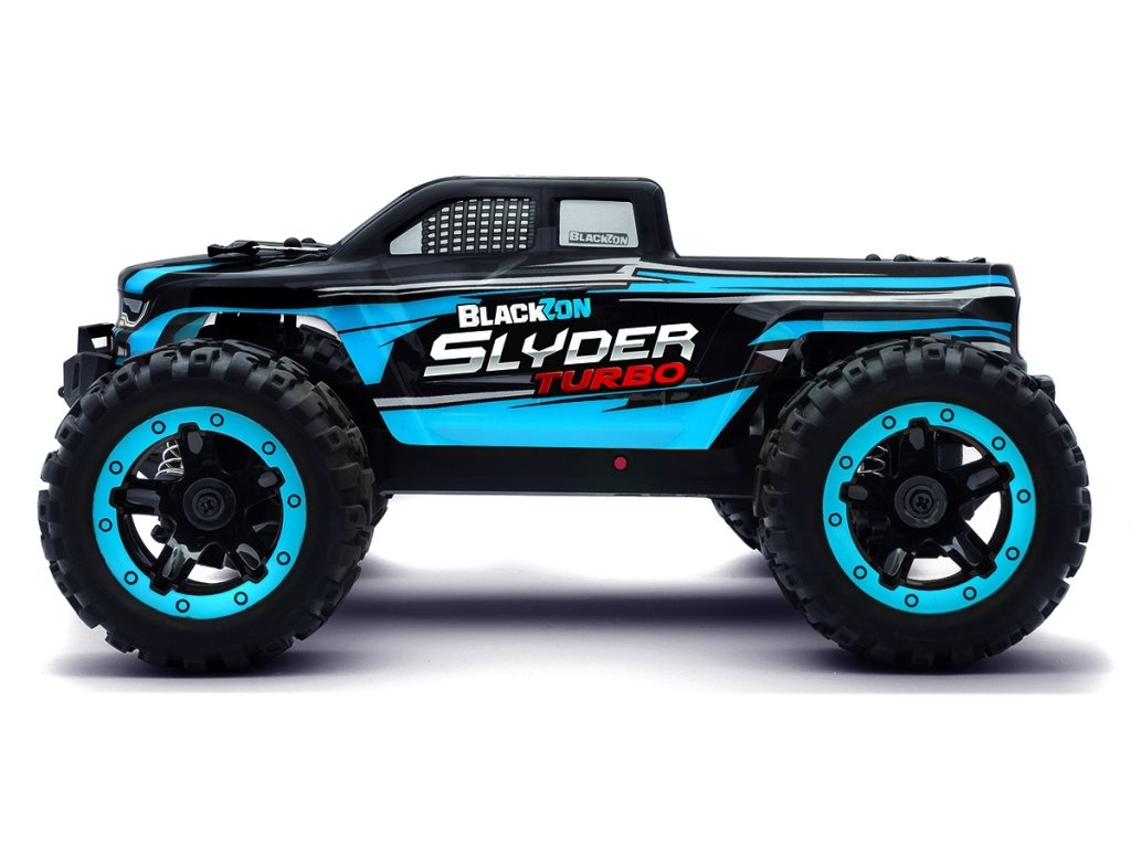 Šestnáctinový RC monster truck je sice malý rozměry, ale velký možnostmi. Tento vůz s pohonem všech 4 kol je připraven čelit skokům a nárazům, a nezaostává ani při nejrůznější akrobacii. Díky 4x4 pohonu, rovnoběžníkovému zavěšení a stavitelným tlumičům zdolá nástrahy každého terénu, a díky krytým převodům a voděodolné elektronice se nezalekne ani kaluží, bláta nebo prachu. Nejen že v zelenočerném kabátku vypadá úžasně, ale doplněn o LED světlomety, je Slyder připraven i k jízdě za zhoršených světelných podmínek nebo v noci. LED světla jsou přibalena k modelu, a podle preferencí jezdce je lze umístit kamkoliv, a poté pouze připojit konektor k akumulátoru.Verze Turbo navíc oproti základnímu Slyderu obsahuje střídavý motor velikosti 390, se kterým model stiskem plynu doslova vyletí vpřed. Aby ho mohl řídit úplně každý, je na jeho vysílači umístěn volič rychlosti, kterým lze nastavit pomalejší tempo pro potřeby začátečníků. Dostanete zde navíc silnější 7.4V 1000mAh LiPo akumulátor, který lze nabíjet přibaleným USB nabíječem pro pohodlnější obsluhu. Celý set je navíc zabalen jako RTR (Ready To Ride), tudíž stačí pouze zapojit akumulátor, vložit do vysílače baterie, a vyrazit do terénu!
