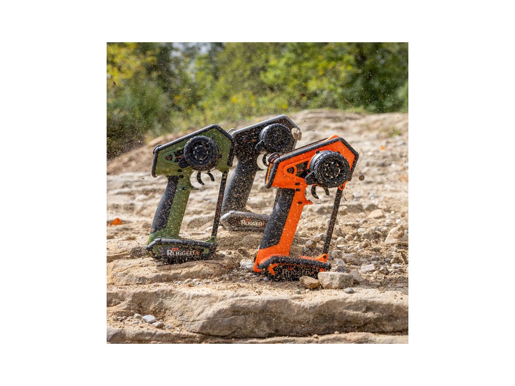 Vysílač verze Rugged má svou konstrukcí zvýšenou odolnost proti mechanickému poškození a do značné míry byla zvýšena odolnost proti vlhkosti. To oceníte nejen když s RC modely jezdíte v náročných podmínkách, ale i při běžném používání. Vysílač Rugged obsahuje tvarované nárazníky z termoplastického polyuretanu (TPU) obklopují skříň a chránící jej před pády, dále dotykové ovládací rozhraní, bezpečnostní vzpěru a robustní konstrukci. K pohybu v menu vysílače slouží inovativní dotykový ovládací panel, který nabízí větší odolnost proti vlhkosti a nečistotám. Jednoduše posuňte prst na ovládacím panelu a klepnutím vyberte z nabídky. Stejně jako jeho předchůdce se vysílač vyznačuje vynikající ergonomií.