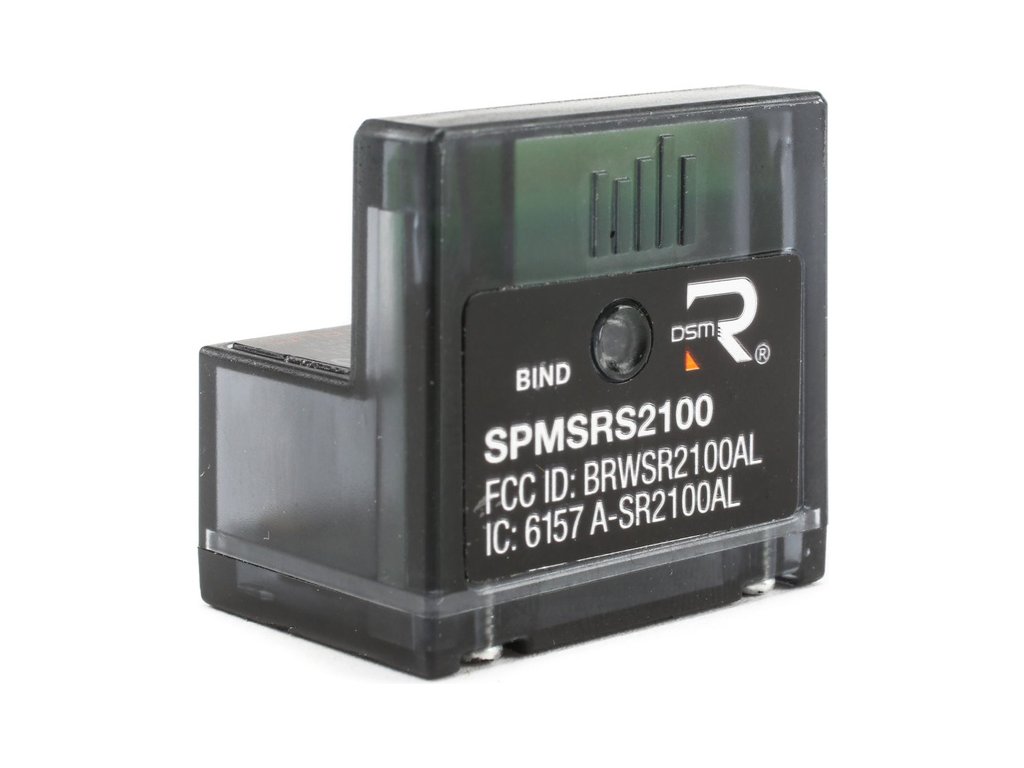 Závodní 3-kanálový mikro přijímač Spektrum SR2100 DSMR® s integrovanou anténou, rychlou odezvou 5.5 ms, povlakem Reliakote proti vlhkosti a tlačítekm Bind pro snadné párování.
