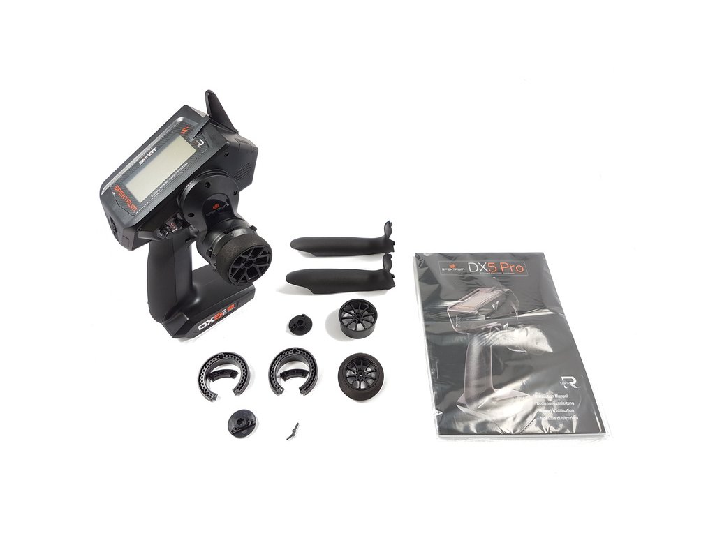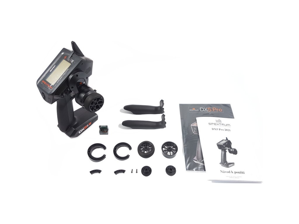 Balení obsahuje RC vysílač DX5 Pro 2021, přijímač, úhlové vložky 10˚ a 15˚, 2x náhradní rukojeť, menší volant, omezení rozsahu volantu 32°, 36°, náhradní kolo volantu. Návod CZ a manuál EN, DE, FR, IT.