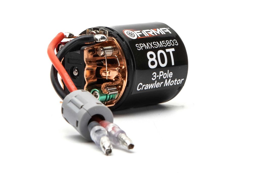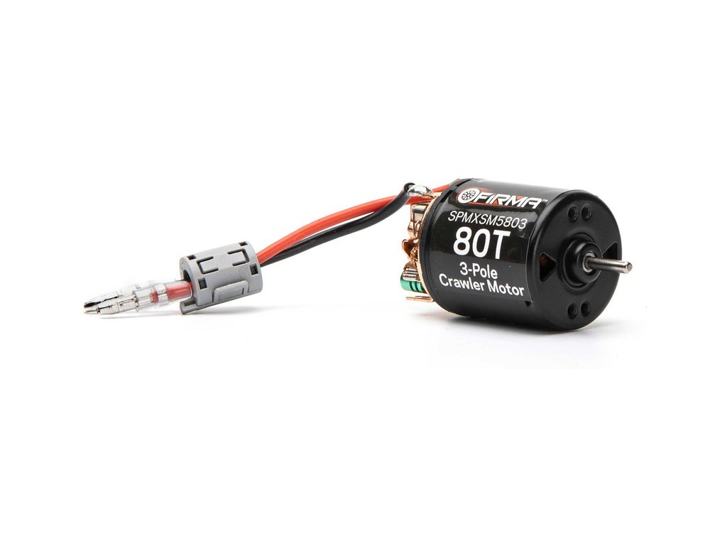Stejnosměrný motor Spektrum Firma řady 540 s 80 závity, má standardní 3 zubový design pro maximální točivý moment a účinnost. Je určen pro RC modely aut typu crawler a expediční. Motor má precizní konstrukci se zapouzdřenými kuličkovými ložisky a vyměnitelnými kartáčky. Kartáčky jsou již z výroby tvarované. Pro náročné uživatele je možnost změnit nastavení časování motoru. Motor doporučujeme používat s 40A (a více) regulátorem.