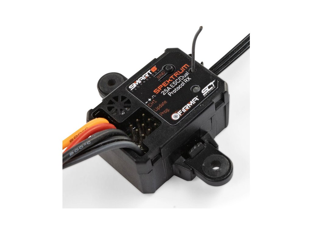Combo 2-v-1 obsahuje integrovaný 2-kanálový Spektrum přijímač s duálním protokolem SLT a DSMR, se stejnosměrný regulátor Firma 25A. Telemetrická data baterie a regulátoru snadno a v reálném čase, přímo na vašem vysílači Spektrum kompatibilním se Smart. Určeno pro RC mini auta 1:16 s napájením 2-3S LiPol.