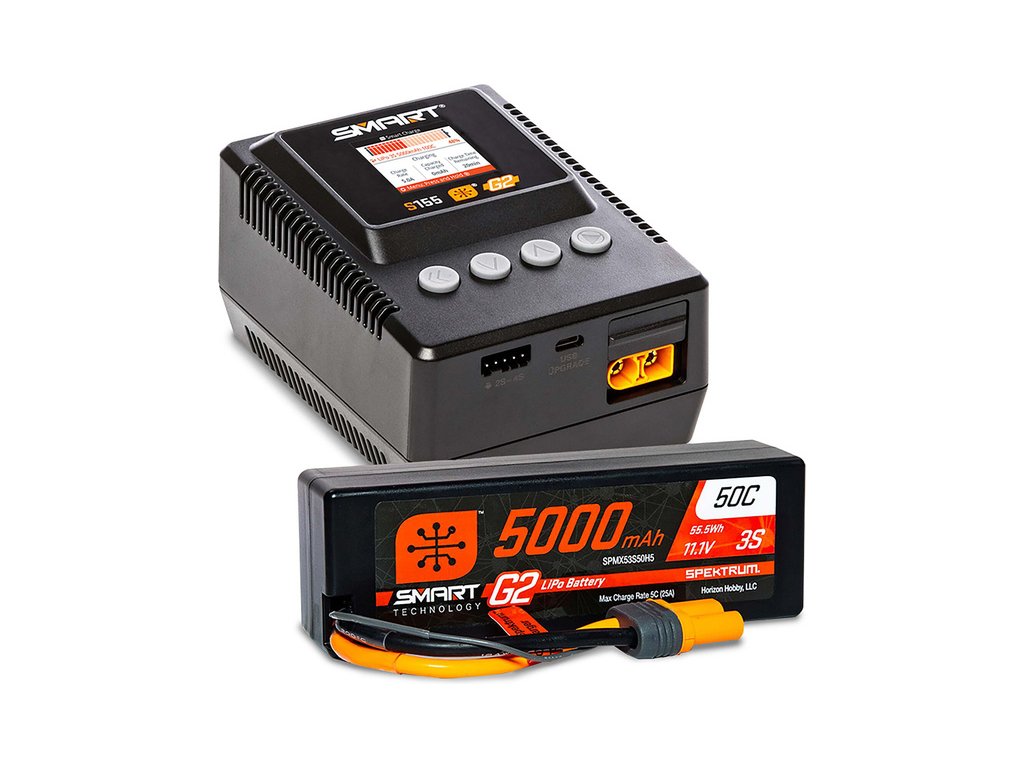 Balíček Spektrum™ Smart Powerstage™ je řešení v jedné krabici pro RC auta 1:8 a 1:10, s 3S LiPo baterií. Sada obsahuje nabíječ Spektrum Smart S155 1x55W AC s technologií SMART, výstup s konektory IC3/IC5, barevný LCD displej a baterii Spektrum Smart G2 LiPol 11.1V 5000mAh 50C HC IC5.
