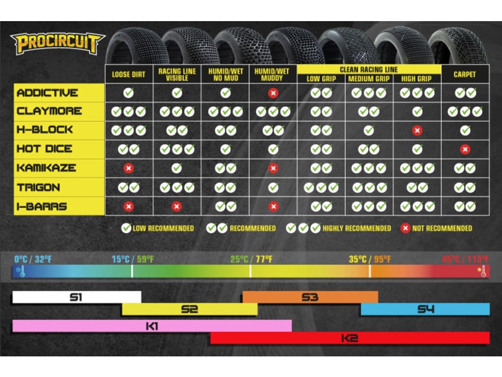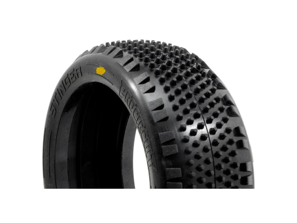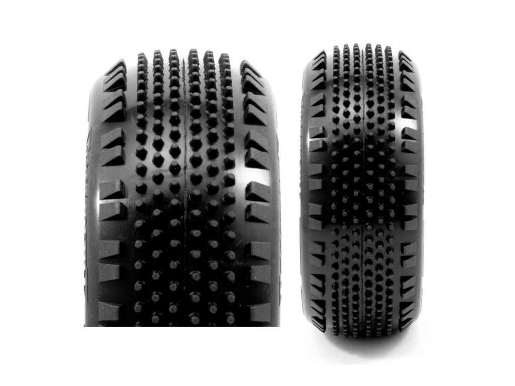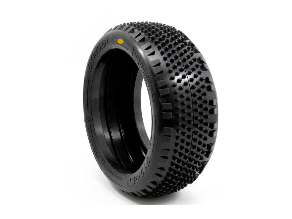 Pneumatika Stinger je speciálně navržena pro astroturfové a kobercové dráhy s vysokou přilnavostí. Je vybavena centrálním vzorkem dlouhých pinů v kombinaci s úhlovými bočními bloky, které zajišťují přímou trakci vpřed a zároveň snižují nadměrný boční záběr při vysokých rychlostech. Výsledkem je čistější a kontrolovanější zatáčení, ideální pro přední nápravu nebo setupy, které upřednostňují snadné a předvídatelné ovládání.
