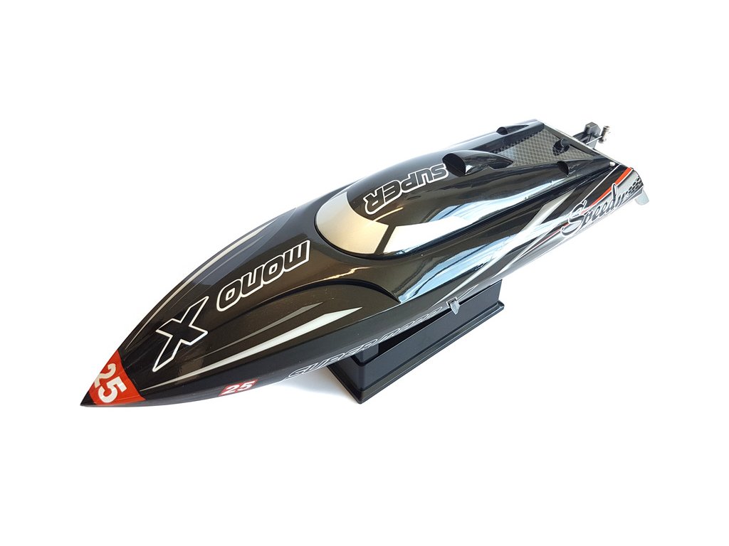 Výkonný rychlostní člun Super Mono X V2 se střídavým motorem 2812-2950kv dokáže jezdit rychlostí až 45km/hod, což je na vodě docela slušná rychlost, Za přijatelnou cenu dostanete model lodi, která má odolný trup z ABS, kompletně nainstalovaný pohon i elektroniku se 30A střídavým regulátorem a volantový vysílač 2,4GHz. Motor i regulátor mají zajištěno vodní chlazení.