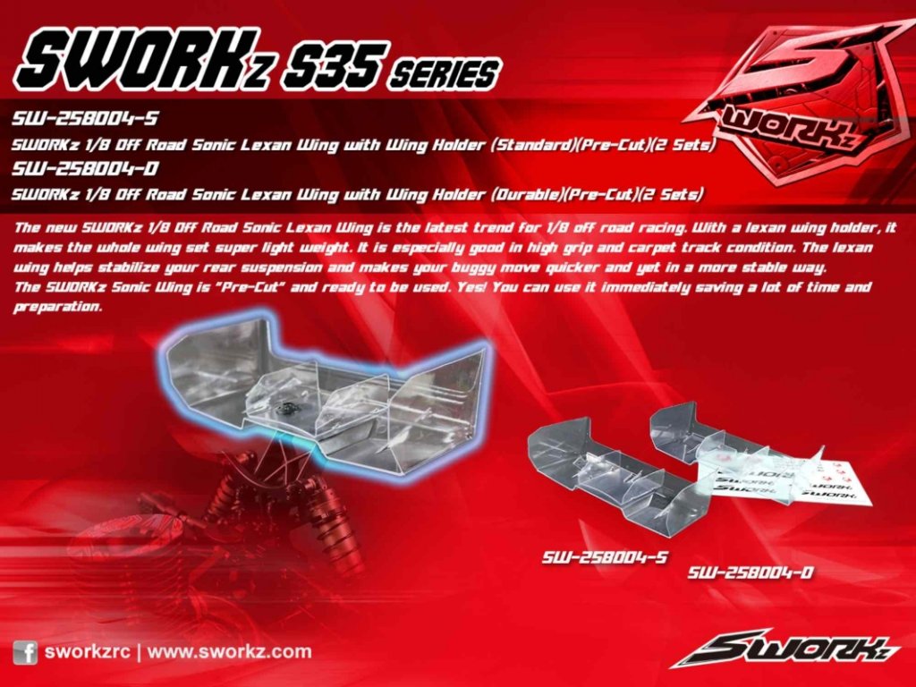 Nové lexanové křídlo SWORKz 1/8 Off Road Sonic je nejnovějším trendem pro 1/8 off road závody. Díky lexanovému držáku je celá sada velmi lehká. Hodí se zejména na tratích s vysokým gripem. Křídlo z lexanu pomáhá stabilizovat zadní nápravu a umožňuje rychlejší a přitom stabilnější pohyb buggy.