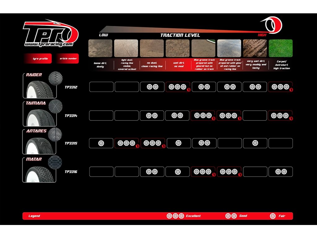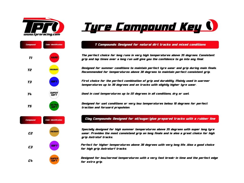 Směs ZR nabízíme v tvrdostech T2-Medium, T3-Soft a T4-Super Soft. Pomocí vhodných přísad je směs ZR k dispozici také v hliněné variantě v tvrdostech C3-Soft a C4-Super Soft. A konečně pro extrémně vlhké a mokré podmínky máme variantu Wet v provedení W5-Ultra Soft. Můžete si tedy vybrat z více než 60 různých pneumatik TPRO. Pro každé použití se tak jistě najde ideální pneumatika.